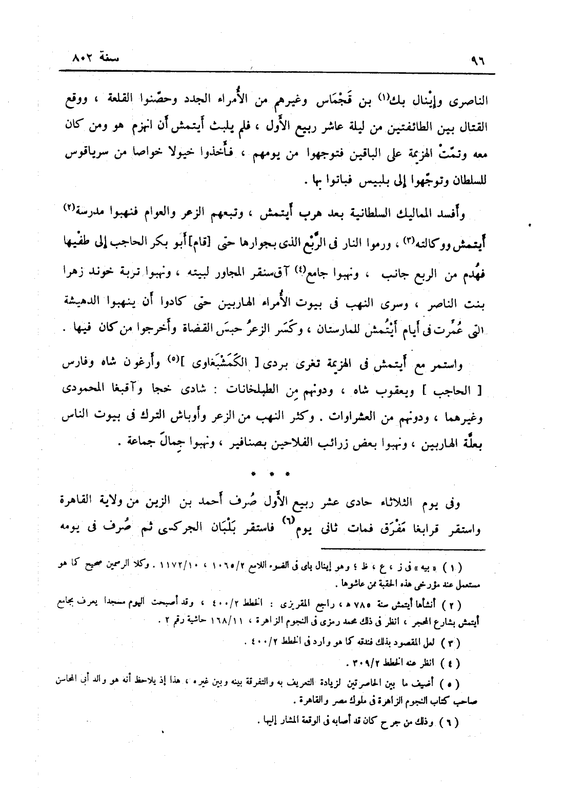 الناصري وإينال باي وابن قجماس وغيرهم من الأمراء الجدد وقد حصنوا القلعة، ووقع القتال بين الطائفتين من ليلة عاشر ربيع الأول فلم يلبث أيتمش أن انهزم هو ومن كان معه وثبتت الهزيمة على الباقين، فتوجهوا من يومهم وأخذوا خيولاً خواص من سرياقوس للسلطان وتوجهوا إلى بلبيس فباتوا بها وأفسد المماليك السلطانية بعد هرب أيتمش، وتبعهم الزعر والعوام فنهبوا مدرسة أيتمش ووكالته ورموا النار في الربع جانباً، ونهبوا جامع آقسنقر المجاور لبيته ونهبوا تربة خوند زهرا بنت الناصر وسرى النهب في بيوت الأمراء الهاربين حتى كادوا أن ينهبوا الدهيشة التي عمرت في أيام أيتمش للمارستان وكسر الزعر حبسي القضاة وأخرجوا من كان فيهما واستمر مع أيتمش في الهزيمة تغري بردى وأرغون شاه وفارس ويعقوب شاه ودونهم من الطبلخانات شادي خجا وآقبغا المحمودي وغيرهما ودونهم من العشراوات، وكثر النهب من الزعر وأوباش الترك في بيوت الناس بعلة الهاربين ونهبوا بعض زرائب الفلاحين بصنافير ونهبوا جمال جماعة.
