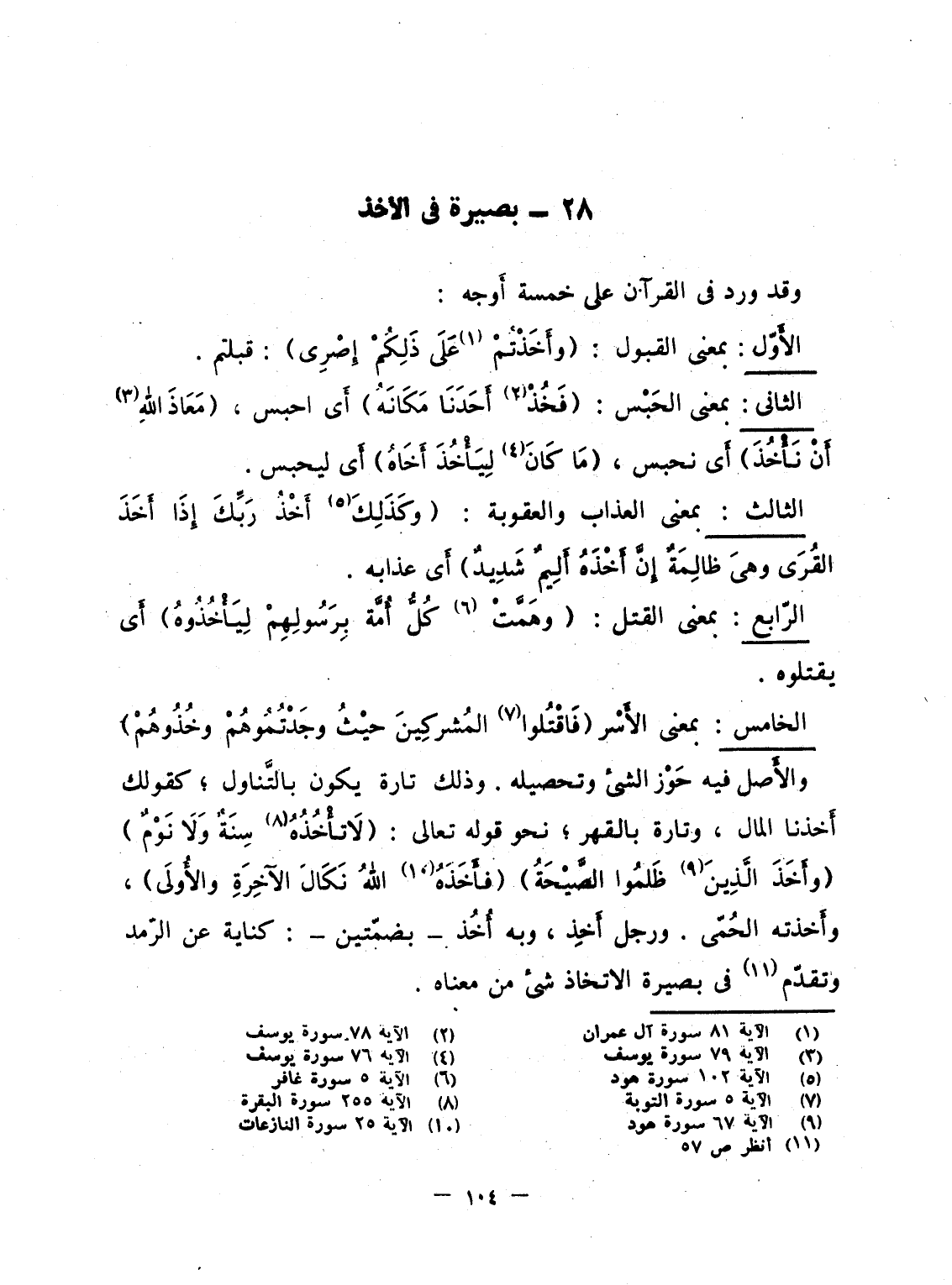 الثانى: بمعنى الحَبْس: {فَخُذْ أَحَدَنَا مَكَانَهُ} أَى احبس، {مَعَاذَ الله أَن نَّأْخُذَ} أَى نحبس، {مَا كَانَ لِيَأْخُذَ أَخَاهُ} أَى ليحبس.