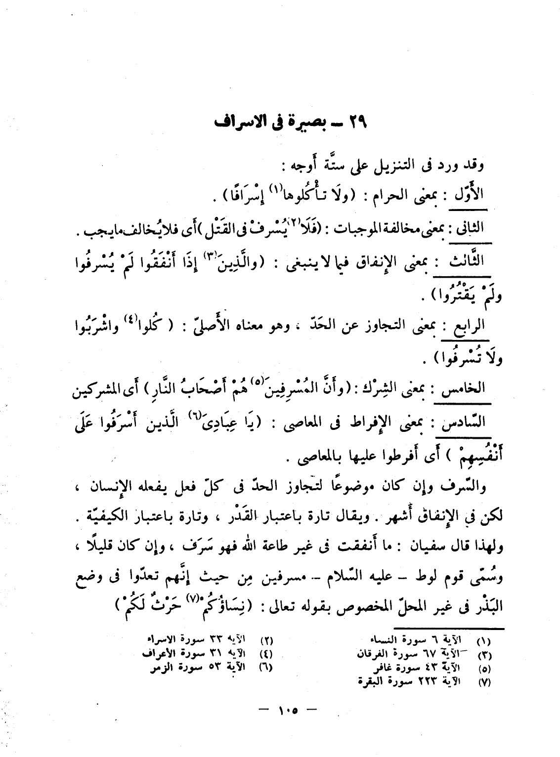 السّادس: بمعنى الإِفراط فى المعاصى: {ياعبادي الذين أَسْرَفُواْ على أَنفُسِهِمْ} أَى أَفرطوا عليها بالمعاصى.