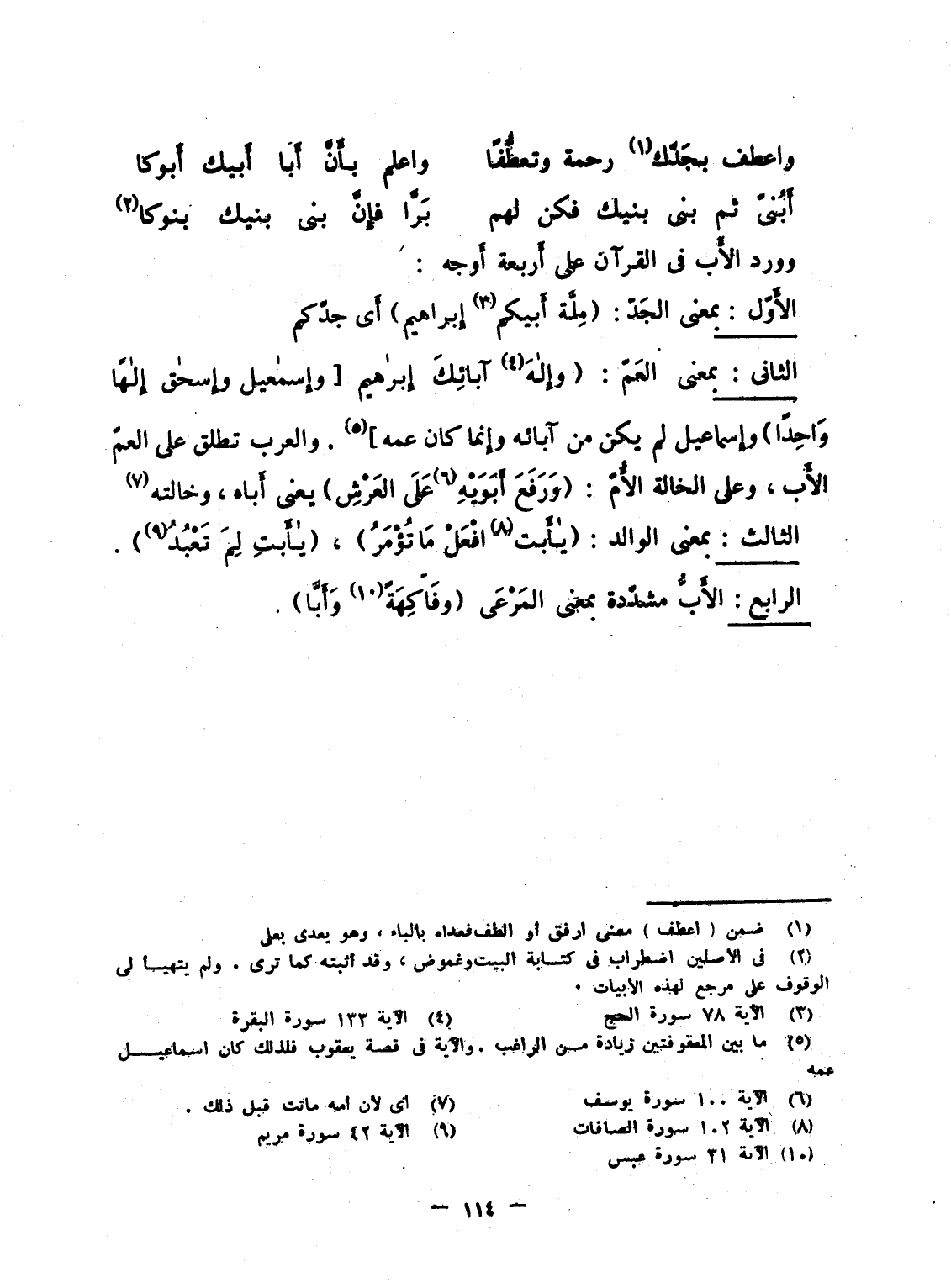 الثانى: بمعنى العَمّ: {وإلاه آبَائِكَ إِبْرَاهِيمَ [وَإِسْمَاعِيلَ وَإِسْحَاقَ إلاها وَاحِداً} وإِسماعيل لم يكن من آبائه وإِنما كان عمه] . والعرب تطلق على العمّ الأَب، وعلى الخالة الأُمّ: {وَرَفَعَ أَبَوَيْهِ عَلَى العرش} يعنى أَباه، وخالته.