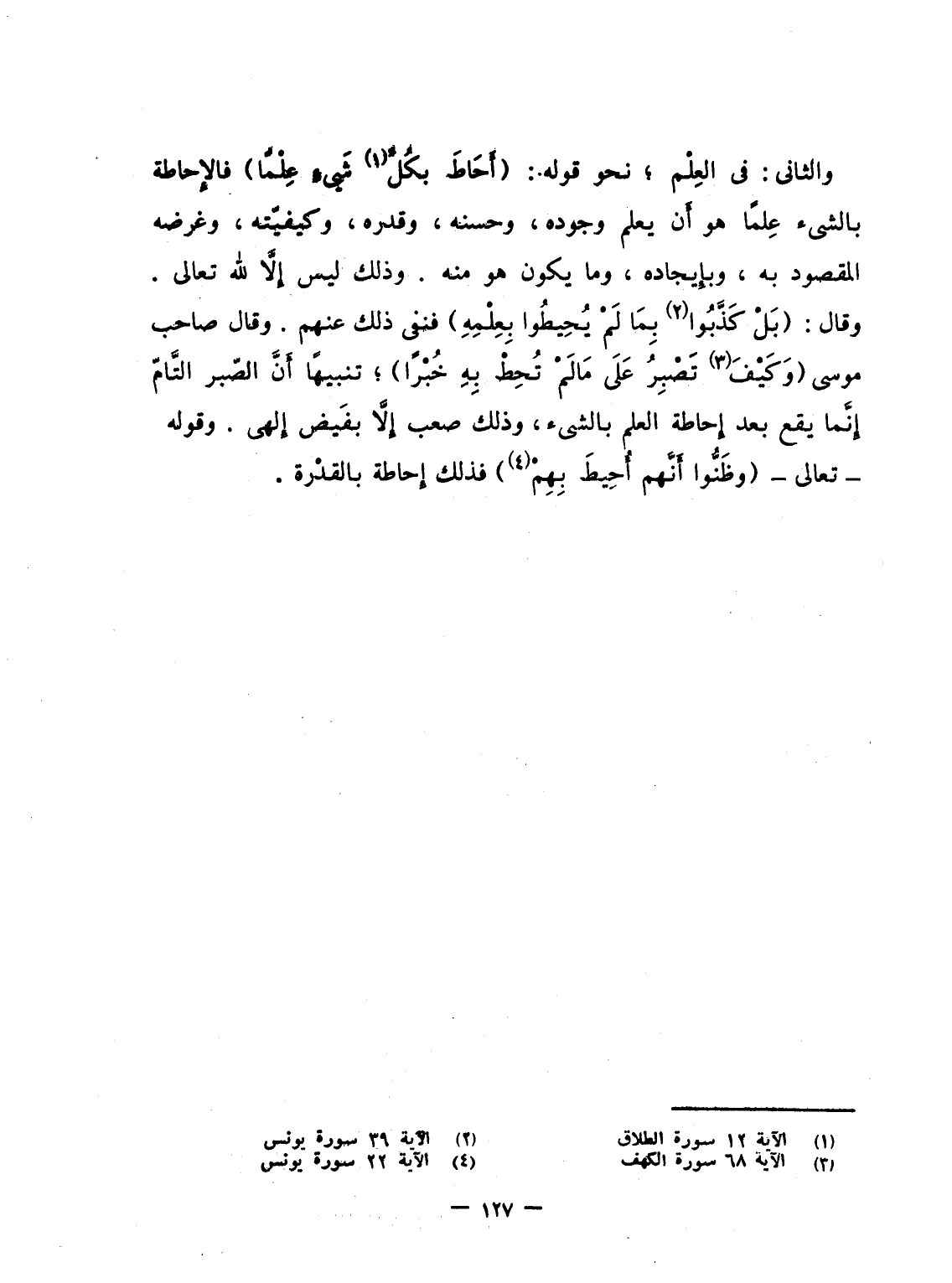 والثانى: فى العِلْم؛ نحو قوله: {أَحَاطَ بِكُلِّ شَيْءٍ عِلْماً} فالإِحاطة بالشئ عِلماً هو أَن يعلم وجوده، وحسنه، وقدره، وكيفيّته، وغرضه المقصود به، وبإِيجاده، وما يكون هو منه. وذلك ليس إِلاَّ لله تعالى. وقال: {بَلْ كَذَّبُواْ بِمَا لَمْ يُحِيطُواْ بِعِلْمِهِ} فنى ذلك عنهم. وقال صاحب موسى {وَكَيْفَ تَصْبِرُ على مَا لَمْ تُحِطْ بِهِ خُبْراً} ؛ تنبيهاً أَنَّ الصّبر التَّامّ إِنَّما يقع بعد إِحاطة العلم بالشئ، وذلك صعب إِلاَّ يفَيض إِلهى. وقوله - تعالى - {وظنوا أَنَّهُمْ أُحِيطَ بِهِمْ} فذلك إِحاطة بالقدْرة.