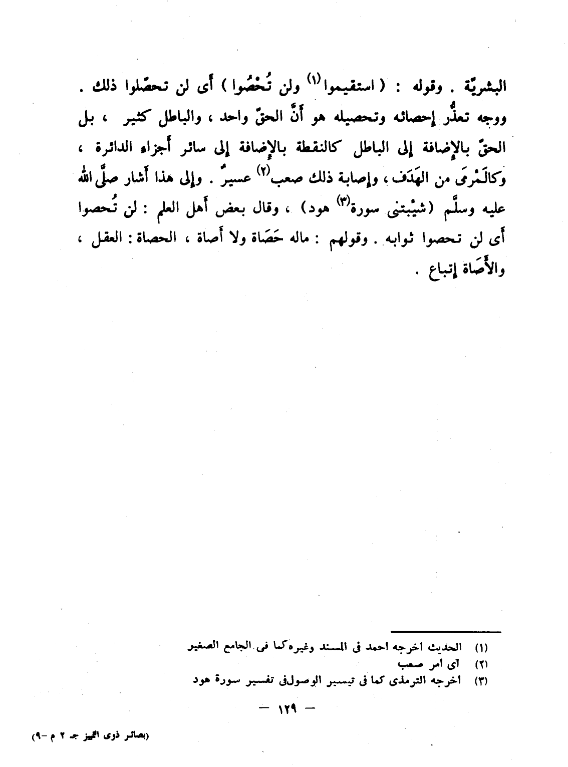 البشريّة. وقوله: "استقيموا ولن تُحْصُوا" أَى لن تحصّلوا ذلك. ووجه تعذُّر إِحصائه وتحصيله هو أَنَّ الحقّ واحد، والباطل كثير، بل الحقّ بالإِضافة إِلى الباطل كالنقطة بالإِضافة إِلى سائر أَجزاءِ الدائرة، وكالَمْرمَى من الهَدَف، وإِصابة ذلك صعب عسيرٌ. وإِلى هذا أَشار صلَّى الله عليه وسلَّم "شيْبتنى سورة هود"، وقال بعض أَهل العلم: لن تُحصوا أَى لن تحصوا ثوابه. وقولهم: ماله حَصَاة ولا أَصاة، الحصاة: العقل، والأَصَاة إِتباع.