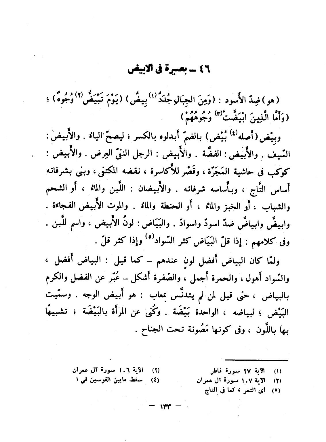 (هو) ضِدّ الأَسود: {وَمِنَ الجبال جُدَدٌ بِيضٌ} {يَوْمَ تَبْيَضُّ وُجُوهٌ} ؛ {وَأَمَّا الذين ابيضت وُجُوهُهُمْ} .