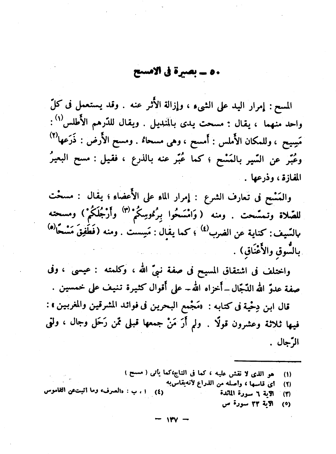 واختلف فى اشتقاق المسيح فى صفة نبىّ الله، وكلمته: عيسى، وفى صفة عدوّ الله الدّجّال - أَخزاه الله - على أَقوال كثيرة تنيف على خمسين.