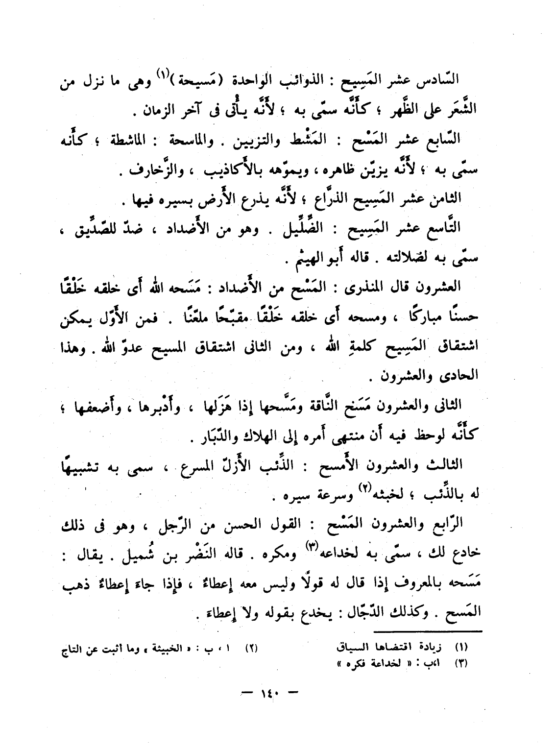 العشرون قال المنذرى: المَسْح من الأَضداد: مَسَحه الله أَى خلقه خَلْقاً حسناً مباركاً، ومسحه أَى خلقه خَلْقاً مقبّحاً ملعّناً. فمن الأَوّل يمكن اشتقاق المَسِيح كلمةِ الله، ومن الثانى اشتقاق المسيح عدوّ الله. وهذا الحادى والعشرون.