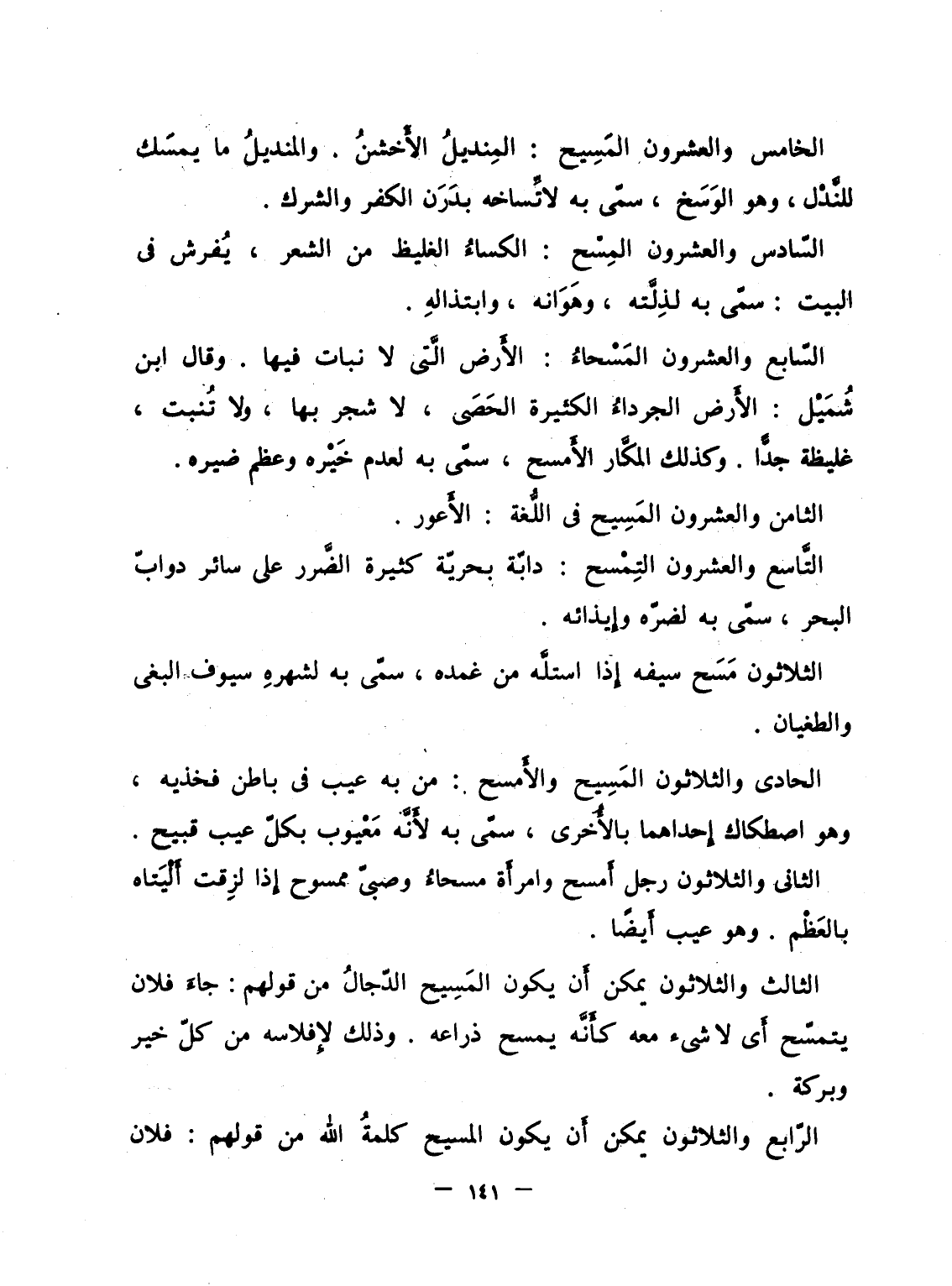 الخامس والعشرون المَسِيح: المِنديلُ الأَخشنُ. والمنديلُ ما يمسَك للنَّدْل، وهو الوَسَخ، سمّى به لاتِّساخه بدَرَن الكفر والشرك.