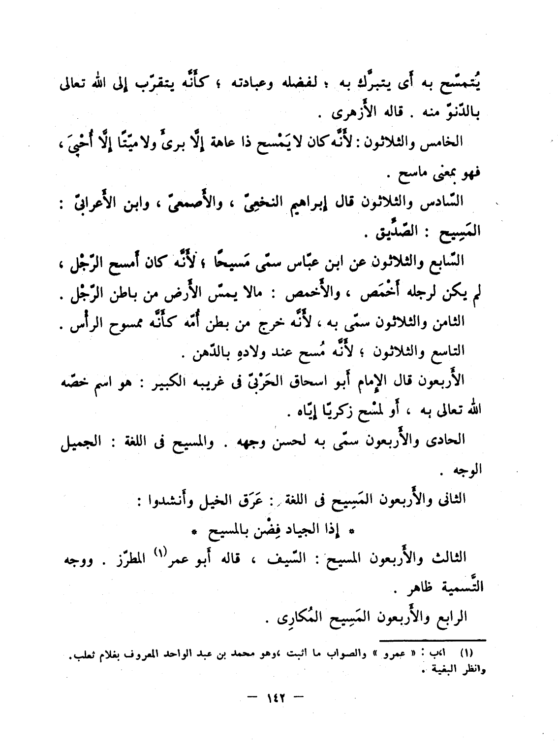 السّادس والثلاثون قال إِبراهيم النخعِىّ، والأَصمعىّ، وابن الأَعرابىّ: المَسِيح: الصّدِّيق.