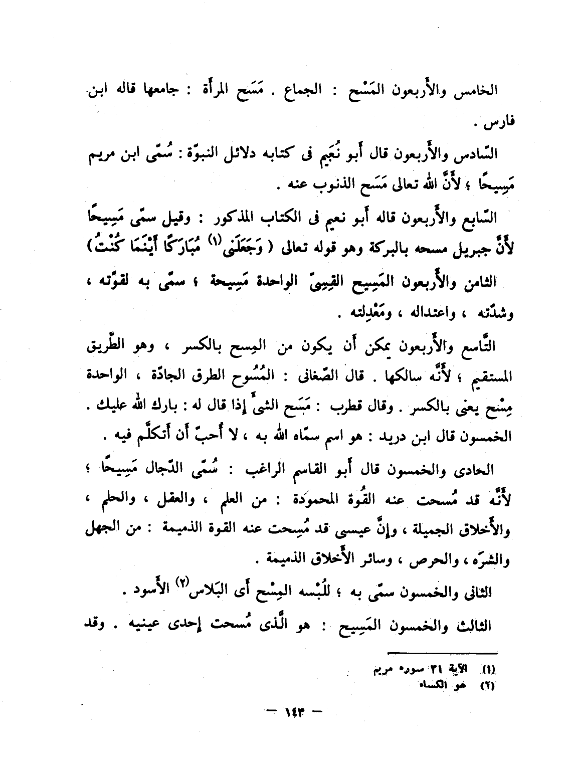 التَّاسع والأَربعون يمكن أَن يكون من المِسح بالكسر، وهو الطَّريق المستقيم؛ لأَنَّه سالكها. قال الصّغانى: المُسُوح الطرق الجادّة، الواحدة مِسْح يعنى بالكسر. وقال قطرب: مَسَح الشئَ إِذا قال له: بارك الله عليك. الخمسون قال ابن دريد: هو اسم سمّاه الله به، لا أُحبّ أَن أَتكلَّم فيه.