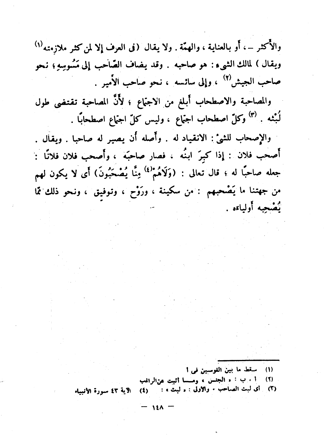 والأَكثر -، أَو بالعناية، والهمّة. ولا يقال (فى العرف إِلا لمن كثر ملازمته ويقال) لمالك الشئِ: هو صاحبه. وقد يضاف الصّاحب إِلى مَسُوسِهِ؛ نحو صاحب الجيش، وإِلى سائسه، نحو صاحب الأَمير.