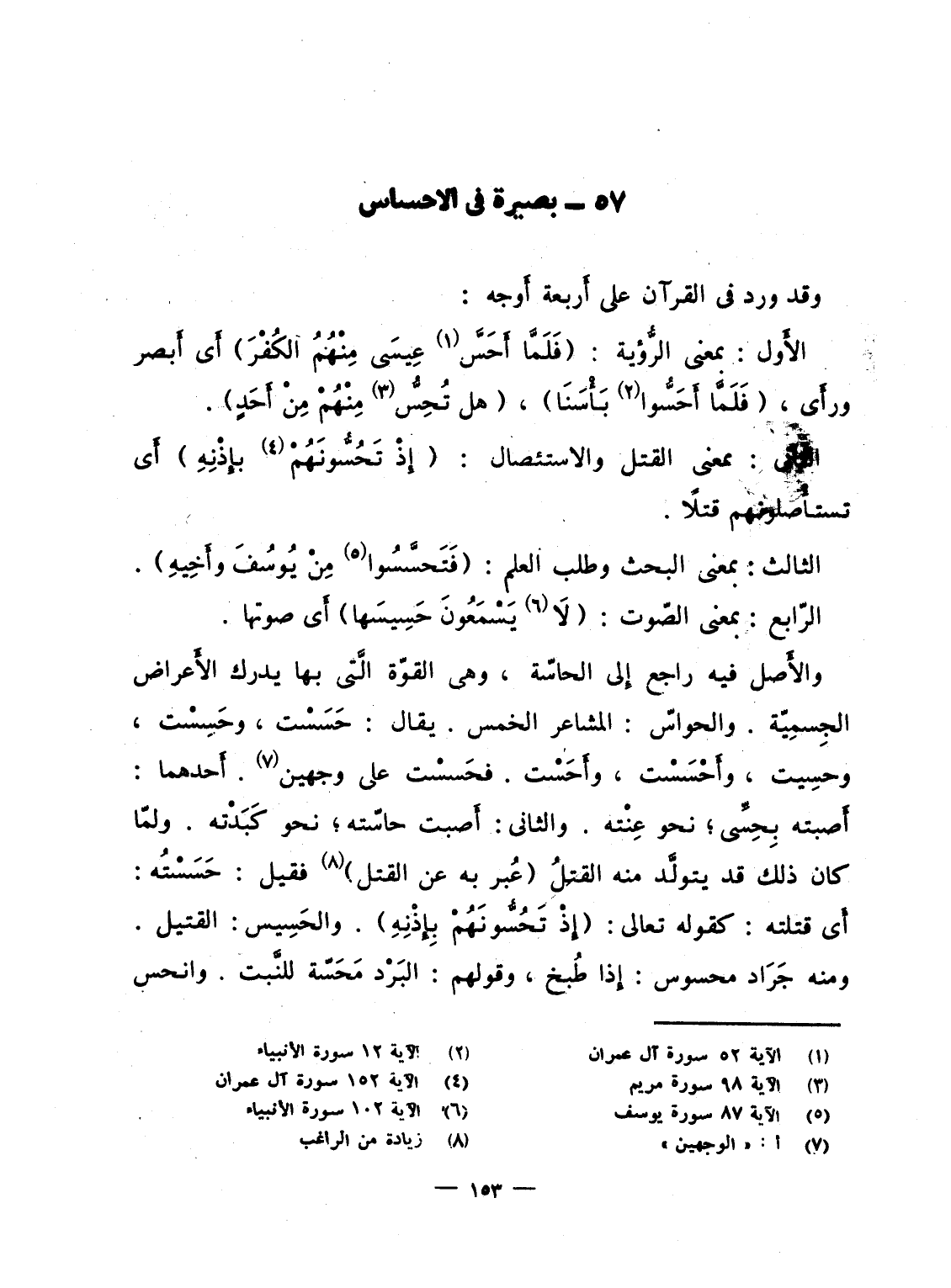 الأَول: بمعنى الرُّؤية: {فَلَمَّآ أَحَسَّ عيسى مِنْهُمُ الكفر} أَى أَبصر ورأَى، {فَلَمَّآ أَحَسُّواْ بَأْسَنَآ} ، {هَلْ تُحِسُّ مِنْهُمْ مِّنْ أَحَدٍ} .