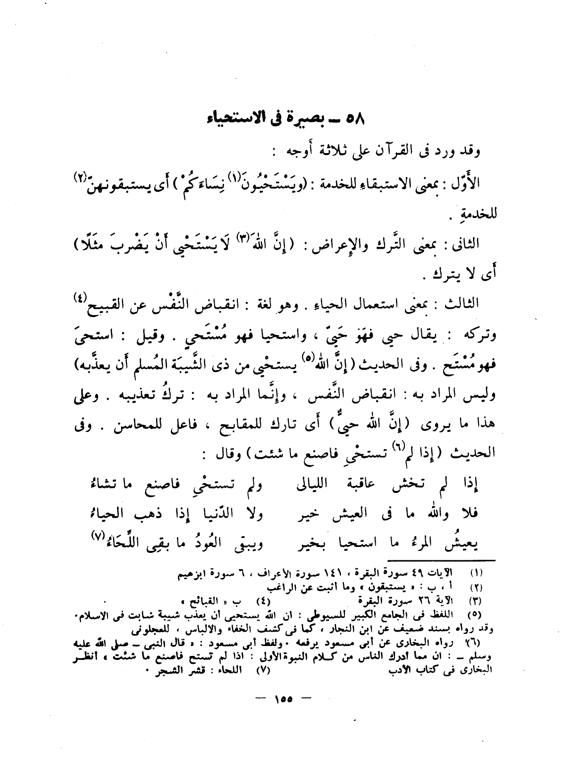 الثالث: بمعنى استعمال الحياءِ. وهو لغة: انقباض النَّفْس عن القبيح وتركه: يقال حي فهو حَيّ، واستحيا فهو مُسْتَحىٍ. وقيل: استحَى فهو مُسْتَح. وفى الحديث "إِنَّ الله يستحْي من ذى الشَّيبَة المُسلم أَن يعذَّبه" وليس المراد به: انقباض النَّفس، وإِنَّما المراد به: تركُ تعذيبه. وعلى هذا ما يروى (إِنَّ الله حيُّ) أَى تارك للمقابح، فاعل المحاسن. وفى الحديث "إِذا لم تستحْىِ فاصنع ما شتئت" وقال:
