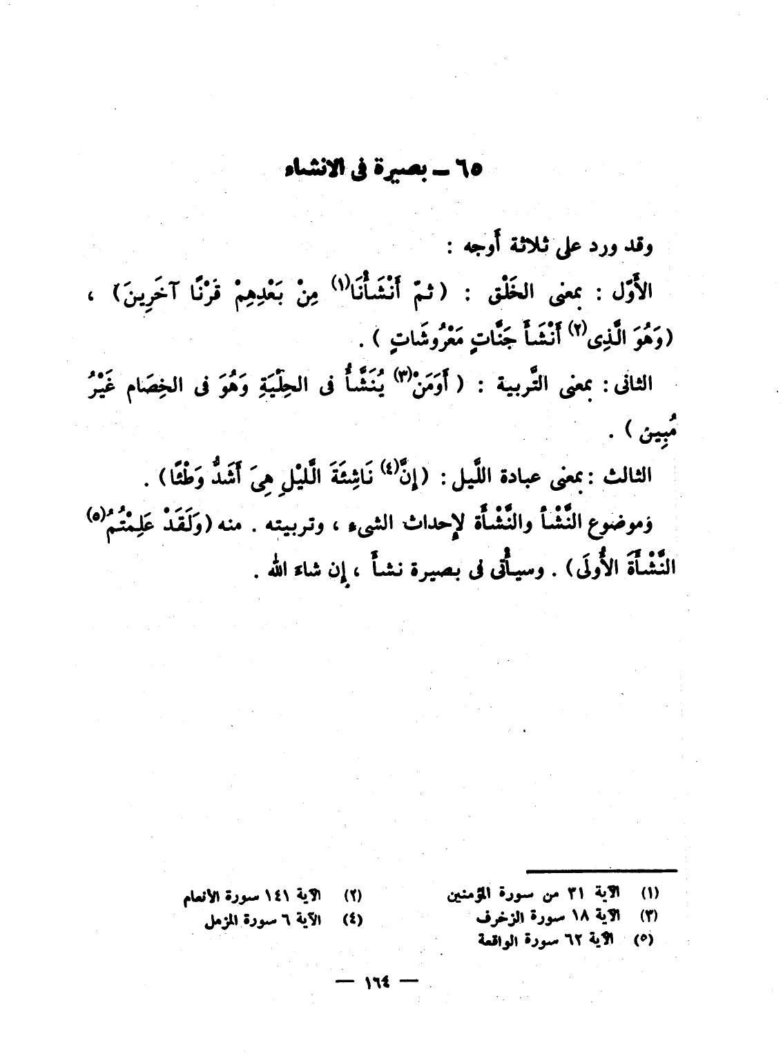 الثانى: بمعنى التَّربية: {أَوَمَن يُنَشَّأُ فِي الحلية وَهُوَ فِي الخصام غَيْرُ مُبِينٍ} .