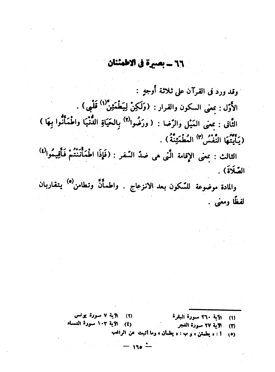 الثَّانى: بمعنى المَيْل والرّضا: {وَرَضُواْ بالحياة الدنيا واطمأنوا بِهَا} {ياأيتها النفس المطمئنة} .