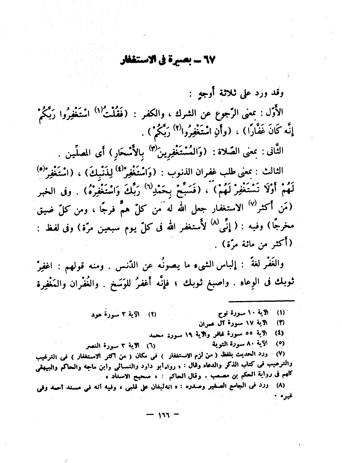 الثالث: بمعنى طلب غفران الذنوب: {واستغفر لِذَنبِكَ} ، {استغفر لَهُمْ أَوْ لاَ تَسْتَغْفِرْ لَهُمْ} ، {فَسَبِّحْ بِحَمْدِ رَبِّكَ واستغفره} . وفى الخبر "مَن أَكثر الاستغفار جعل الله له من كلّ همٍّ فرجاً، ومن كلّ ضيق مخرجاً" وفيه: "إِنِّى لأَستغفر الله فى كلّ يوم سبعين مرّة" وفى لفظ: "أكثر من مائة مرّة".