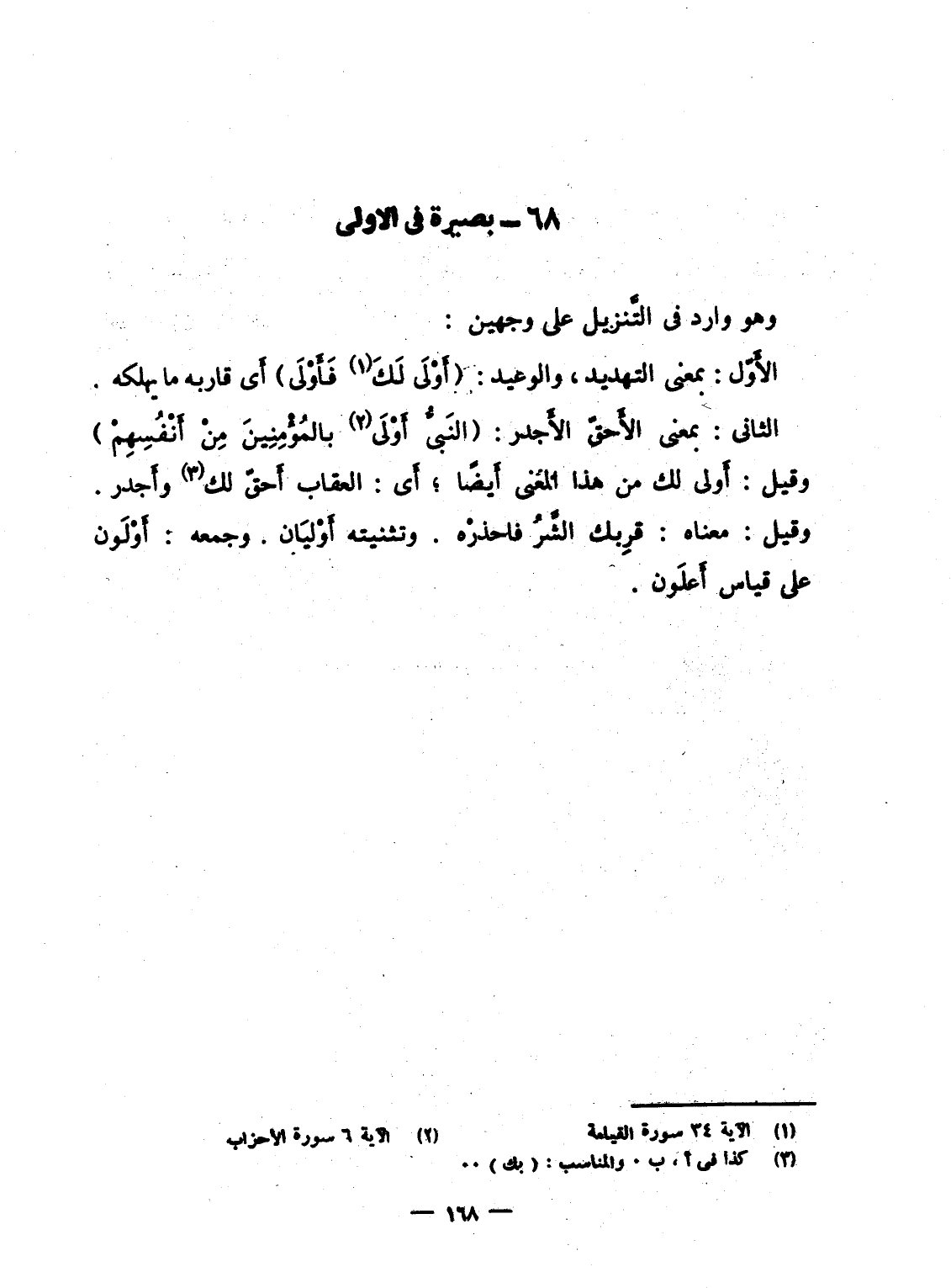 الثانى: بمعنى الأَحقّ الأَجدر: {النبي أولى بالمؤمنين مِنْ أَنْفُسِهِمْ} وقيل: أَولى لك من هذا المعنى أَيضاً؛ أَى: العقاب أَحقّ لك وأَجدر. وقيل: معناه: قرِبك الشَّرُ فاحذرْه. وتثنيته أَوْليَان. وجمعه: أَوْلَون على قياس أَعلَون.