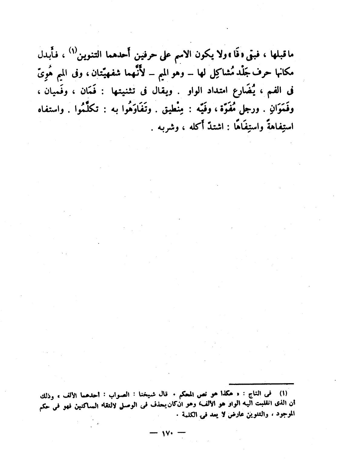 ما قبلها، فبقى "فَا" ولا يكون الاسم على حرفين أَحدهما التنوين، فأَبدل مكانها حرف جَلْد مُشاكِل لها - وهو الميم - لأَنَّهما شفهيّتان، وفى الميم هُوِىّ فى الفم، يُضَارع امتداد الواو. ويقال فى تثنيتها: فَمَان، وفَميان، وفَمَوَانِ. ورجل مُفَوّة، وفَيّه: مِنْطيق. وتَفَاوَهُوا به: تكلَّمُوا. واستفاه استِفاهةً واستِفَاهاً: اشتدّ أَكله، وشربه.