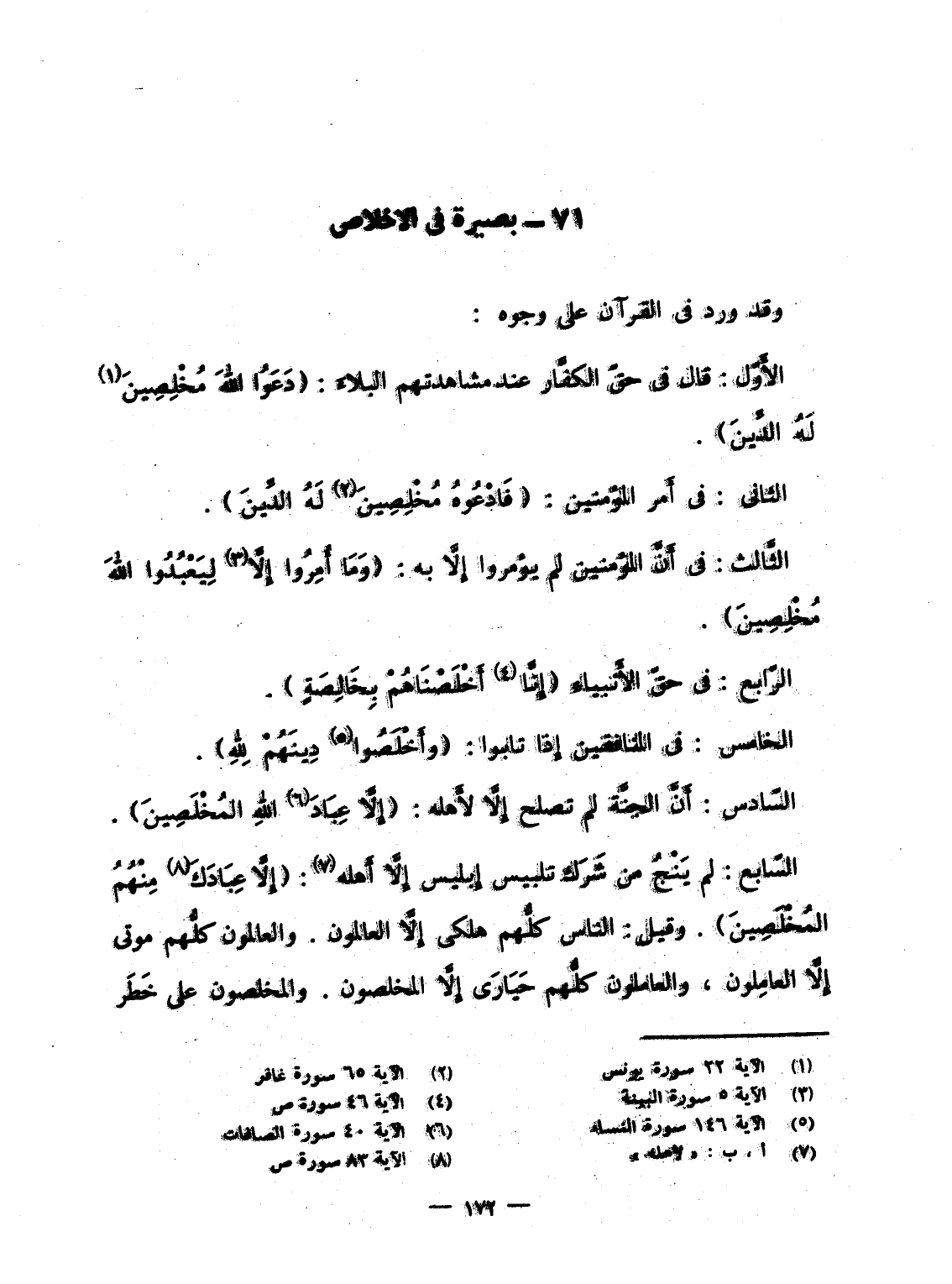 الخامس: فى المنافقين إِذا تابوا: {وَأَخْلَصُواْ دِينَهُمْ للَّهِ} . السّادس: أَنَّ الجنَّة لم تصلح إِلاَّ لأَهله: {إِلاَّ عِبَادَ الله المخلصين} .