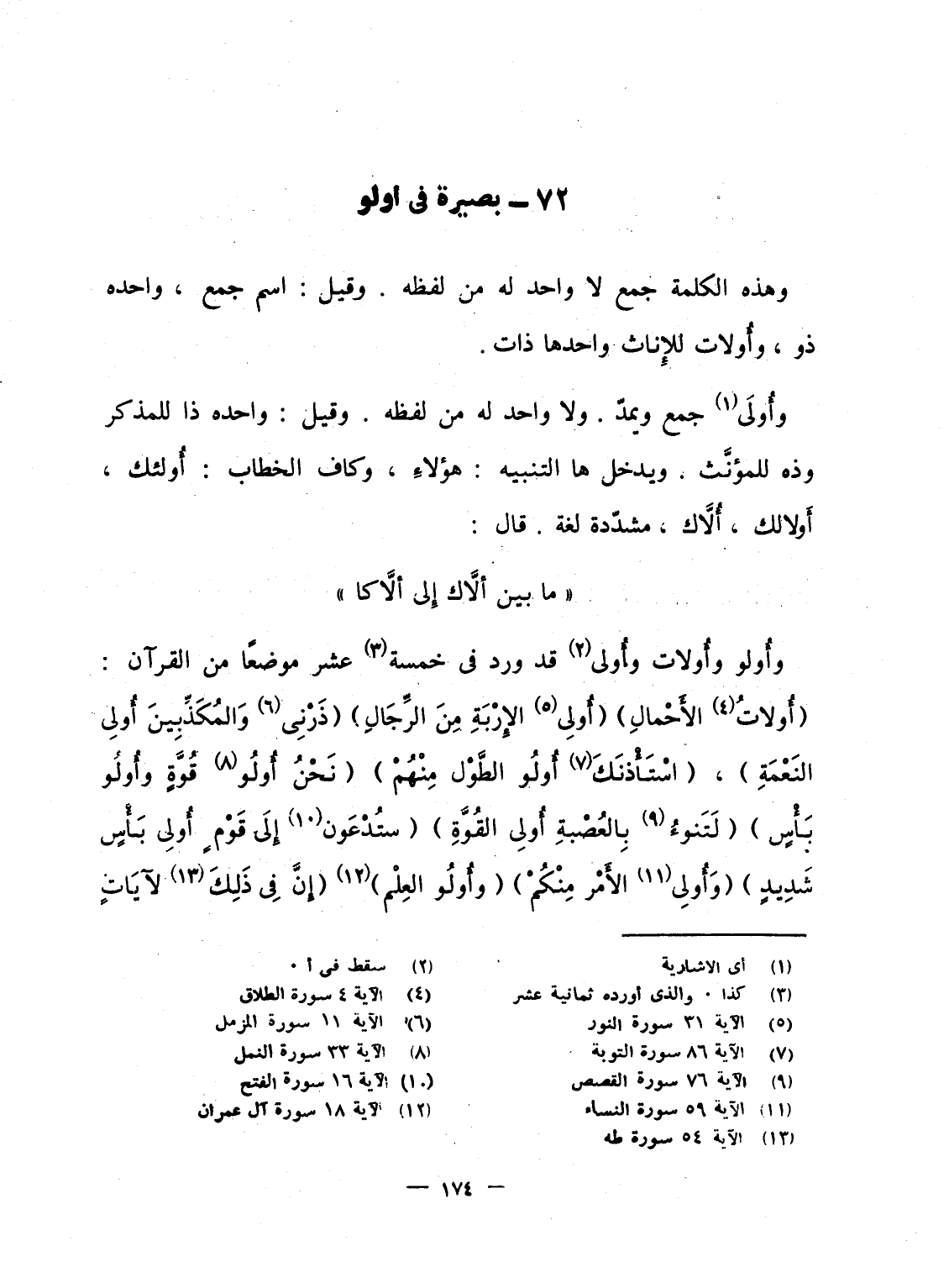 وأُولو وأُولات وأُولى قد ورد فى خمسة عشر موضعاً من القرآن: {وَأُوْلاَتُ الأحمال} {أُوْلِي الإربة مِنَ الرجال} {وَذَرْنِي والمكذبين أُوْلِي النعمة} ، {استأذنك أُوْلُواْ الطول مِنْهُمْ} {نَحْنُ أُوْلُو قُوَّةٍ وَأُولُو بَأْسٍ شَدِيدٍ} {لَتَنُوءُ بالعصبة أُوْلِي القوة} {سَتُدْعَوْنَ إلى قَوْمٍ أُوْلِي بَأْسٍ شَدِيدٍ} {وَأُوْلِي الأمر مِنْكُمْ} {وَأُوْلُواْ العلم} {إِنَّ فِي ذلك لآيَاتٍ