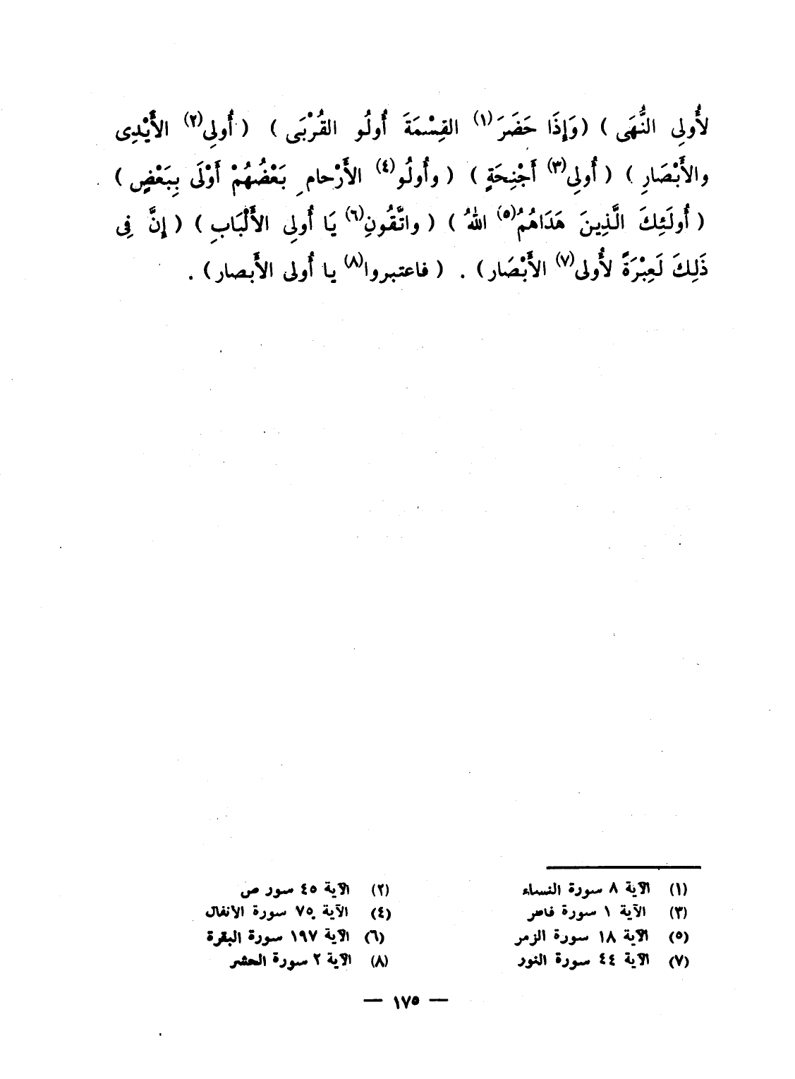 لأُوْلِي النهى} {وَإِذَا حَضَرَ القسمة أُوْلُواْ القربى} {أُوْلِي الأيدي والأبصار} {أولي أَجْنِحَةٍ} {وَأْوْلُواْ الأرحام بَعْضُهُمْ أولى بِبَعْضٍ} {أولائك الذين هَدَاهُمُ الله} {واتقون ياأولي الألباب} {إِنَّ فِي ذلك لَعِبْرَةً لأُوْلِي الأبصار} {فاعتبروا ياأولي الأبصار} .