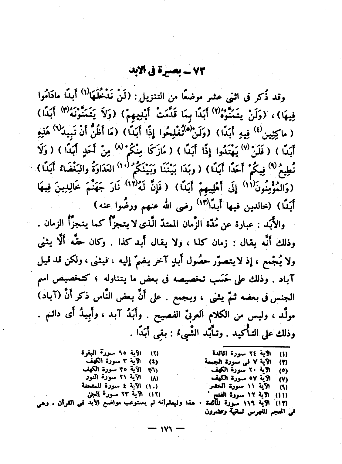 وقد ذُكر فى اثنى عشر موضعاً من التنزيل: {لَنْ نَّدْخُلَهَآ أَبَداً مَّا دَامُواْ فِيهَا} ، {وَلَنْ يَتَمَنَّوْهُ أَبَداً بِمَا قَدَّمَتْ أَيْدِيهِمْ} {وَلاَ يَتَمَنَّونَهُ أَبَداً} {مَّاكِثِينَ فِيهِ أَبَداً} {وَلَن تفلحوا إِذاً أَبَداً} {مَآ أَظُنُّ أَن تَبِيدَ هاذه أَبَداً} {فَلَنْ يهتدوا إِذاً أَبَداً} {مَا زَكَا مِنكُمْ مِّنْ أَحَدٍ أَبَداً} {وَلاَ نُطِيعُ فيكُمْ أَحَداً أَبَداً} {وَبَدَا بَيْنَنَا وَبَيْنَكُمُ العداوة والبغضآء أَبَداً} {والمؤمنون إلى أَهْلِيهِمْ أَبَداً} {فَإِنَّ لَهُ نَارَ جَهَنَّمَ خَالِدِينَ فِيهَآ أَبَداً} {خَالِدِينَ فِيهَآ أَبَداً رَّضِيَ الله عَنْهُمْ وَرَضُواْ عَنْهُ} .