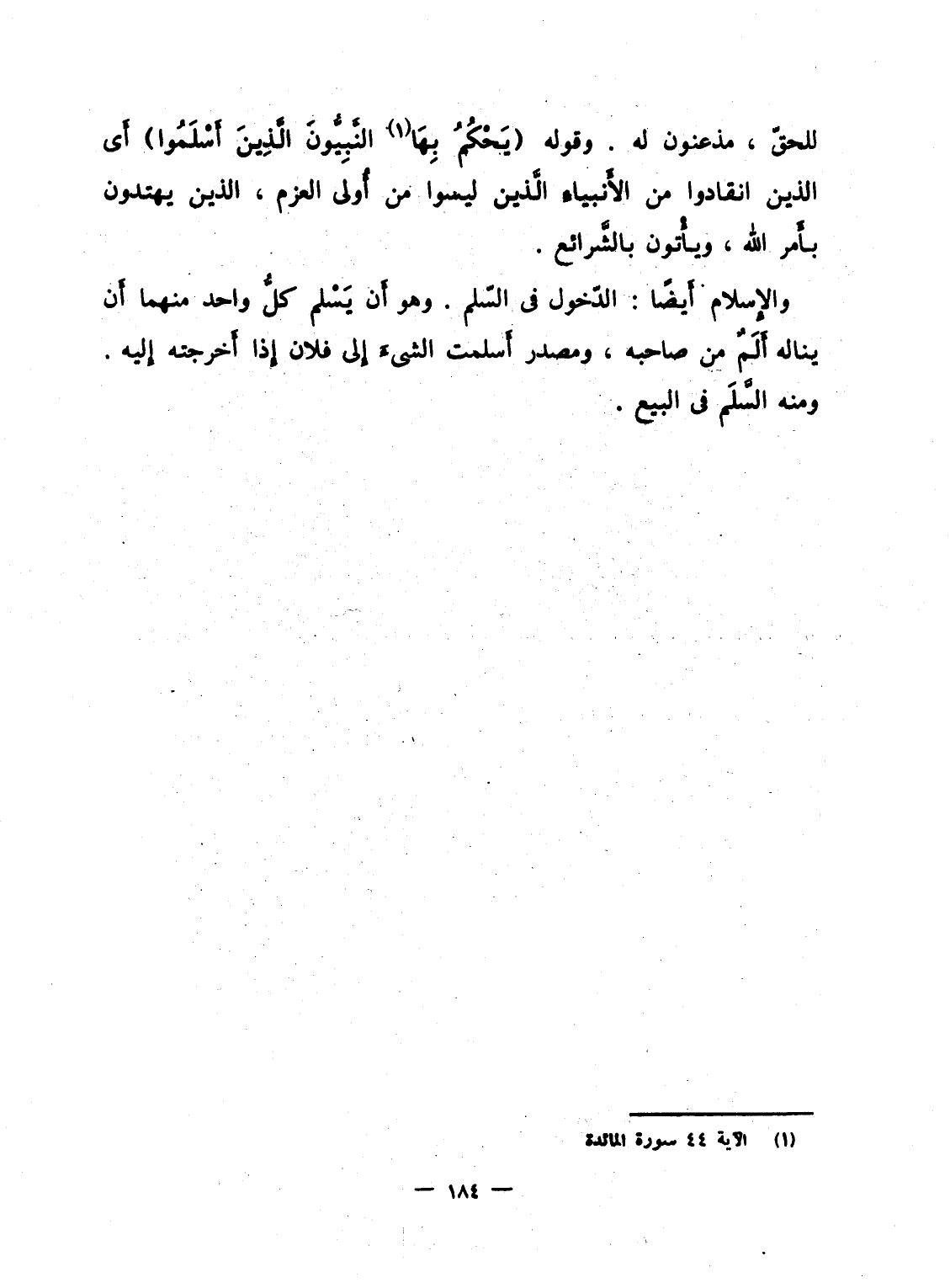 والإِسلام أَيضاً: الدّخول فى السّلم. وهو أَن يَسْلم كلُّ واحد منهما أَن يناله أَلَمٌ من صاحبه، ومصدر أَسلمت الشئَ إِلى فلان إِذا أَخرجته إِليه. ومنه السَّلَم فى البيع.