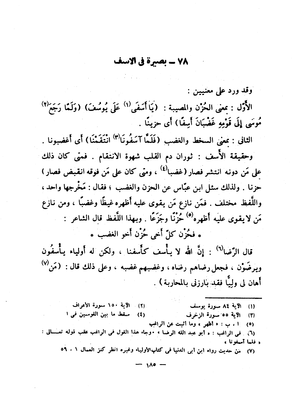 قال الرّضا: إِنَّ الله لا يأْسف كأَسفنا، ولكن له أَولياء يأْسفُون ويرضَوْن، فجعل رضاهم رضاه، وغضبهم غضبه. وعلى ذلك قال: "مَن أَهان لى ولِيّاً فقد بارَزنى بالمحاربة".