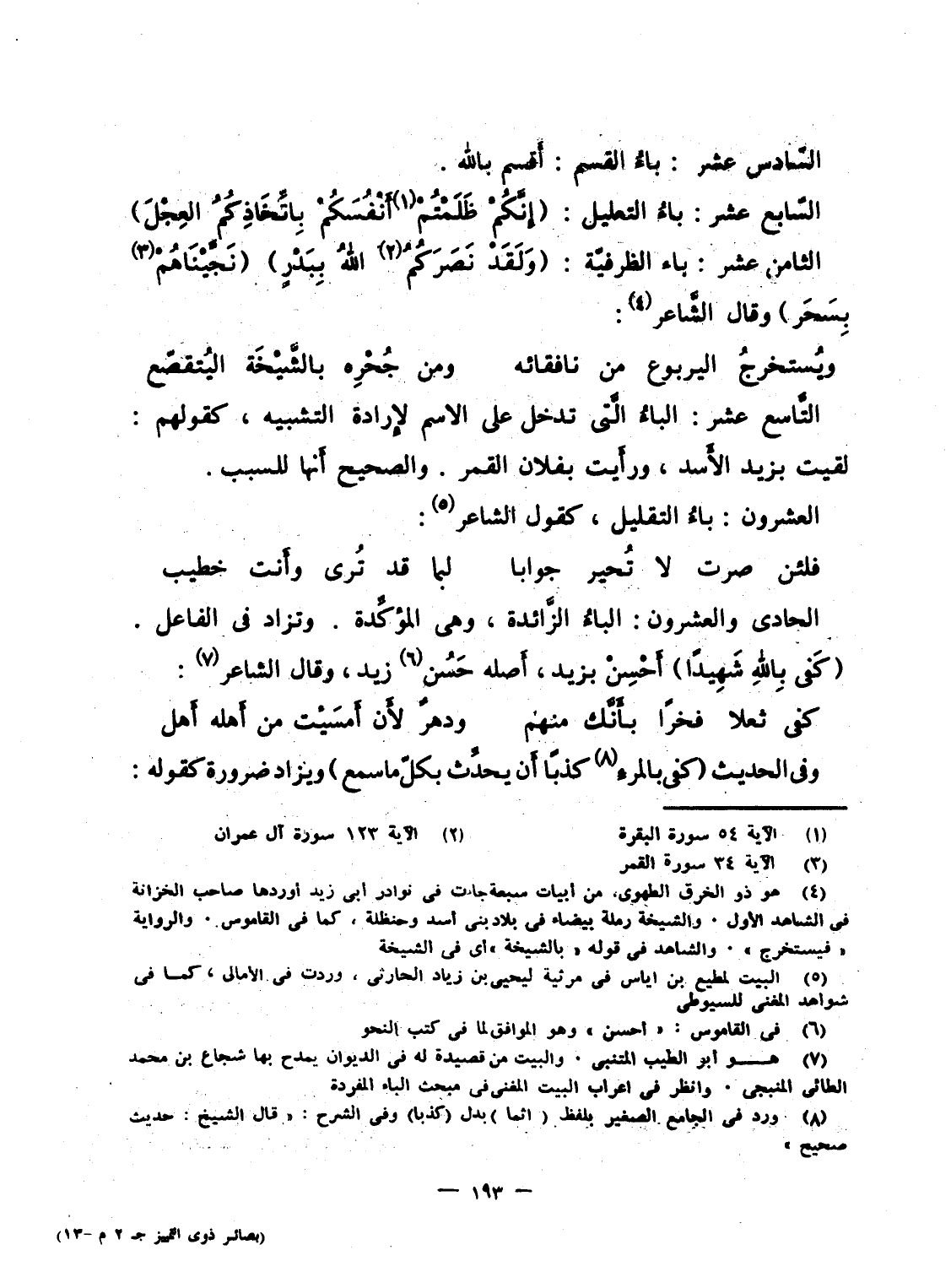 الثامن عشر: باء الظرفيّة: {وَلَقَدْ نَصَرَكُمُ الله بِبَدْرٍ} {نَّجَّيْنَاهُم بِسَحَرٍ} وقال الشَّاعر: