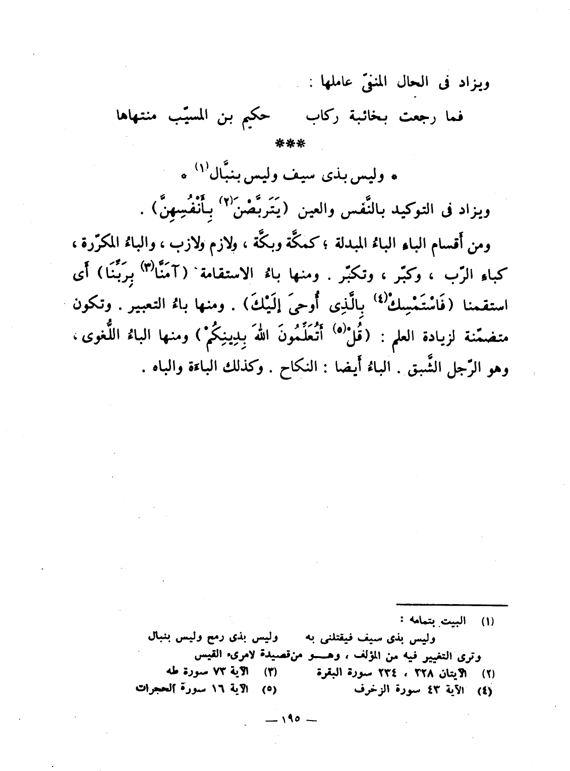 ومن أقسام الباءِ الباءُ المبدلة؛ كمكَّة وبكَّة، ولازم ولازب، والباءُ المكرّرة، كباءِ الرّب، وكبّر، وتكبّر. ومنها باءُ الاستقامة {آمَنَّا بِرَبِّنَا} أَى استقمنا {فاستمسك بالذي أُوحِيَ إِلَيْكَ} . ومنها باءُ التعبير. وتكون متضمّنة لزيادة العلم: {قُلْ أَتُعَلِّمُونَ الله بِدِينِكُمْ} ومنها الباءُ اللُّغوى، وهو الرّجل الشَّبق. الباءُ أَيضاً: النكاح. وكذلك الباءَة والباه.