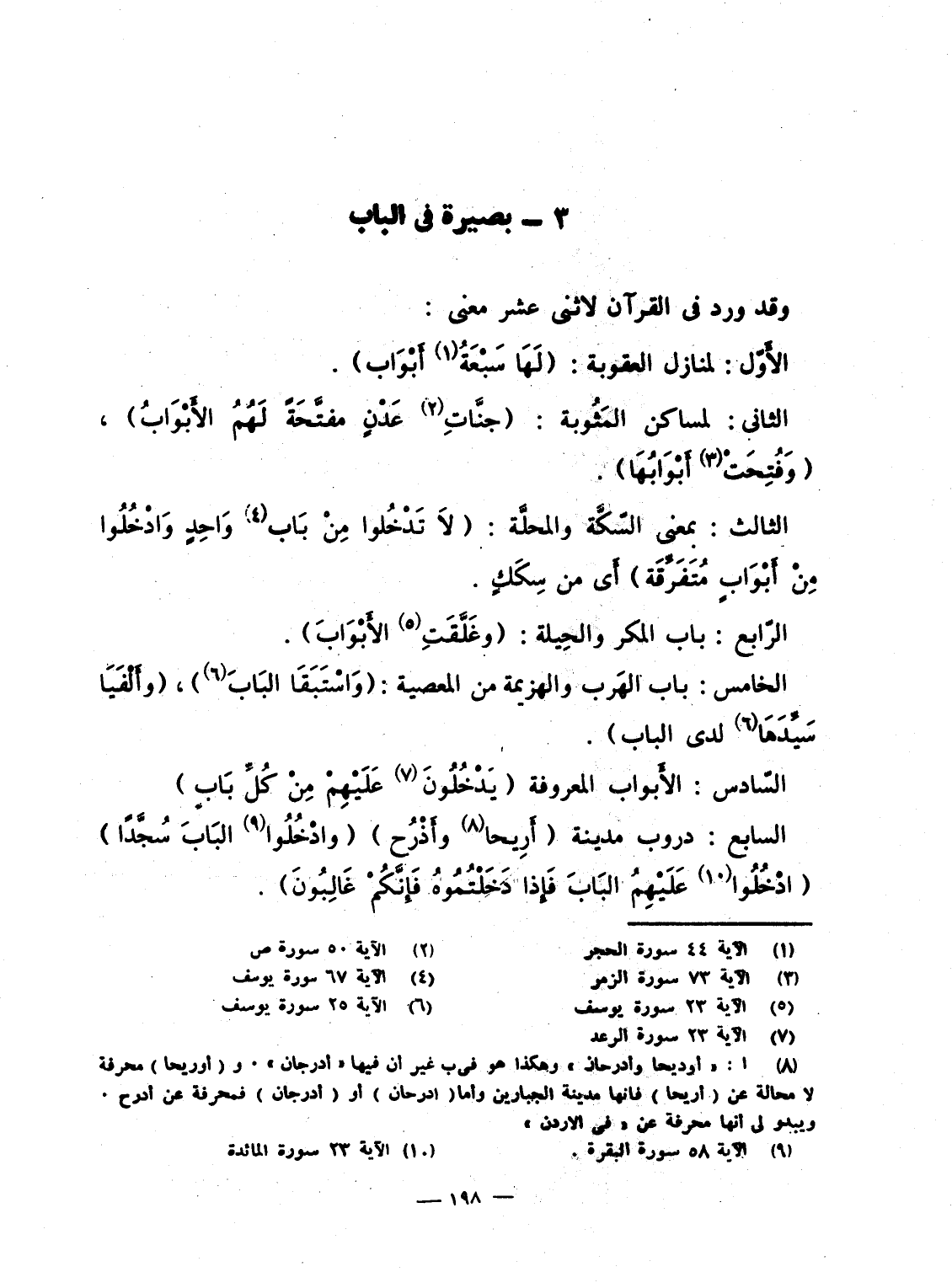 الثالث: بمعنى السّكَّة والمحلَّة: {وَقَالَ يابني لاَ تَدْخُلُواْ مِن بَابٍ وَاحِدٍ وادخلوا مِنْ أَبْوَابٍ مُّتَفَرِّقَةٍ} أَى من سِكَكٍ.