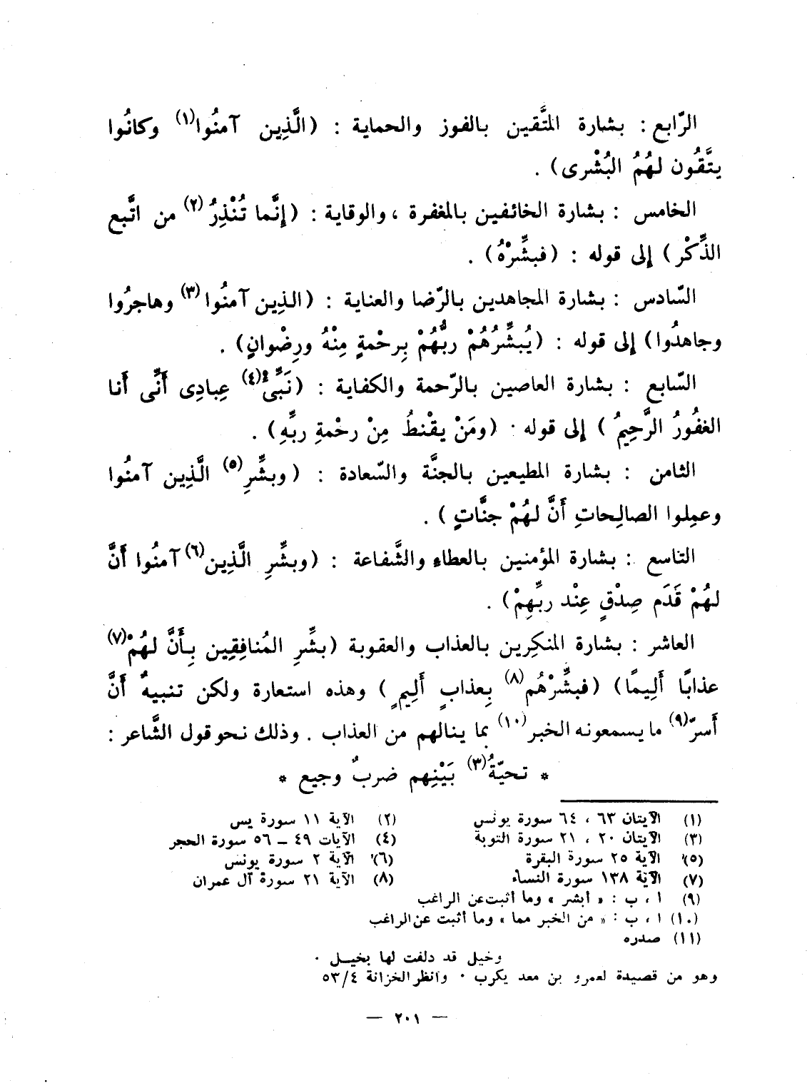 العاشر: بشارة المنكِرين بالعذاب والعقوبة {بَشِّرِ المنافقين بِأَنَّ لَهُمْ عَذَاباً أَلِيماً} {فَبَشِّرْهُم بِعَذَابٍ أَلِيمٍ} وهذه استعارة ولكن تنبيهٌ أَنَّ أَسرّ ما يسمعونه الخبر بما ينالهم من العذاب. وذلك نحو قول الشَّاعر: