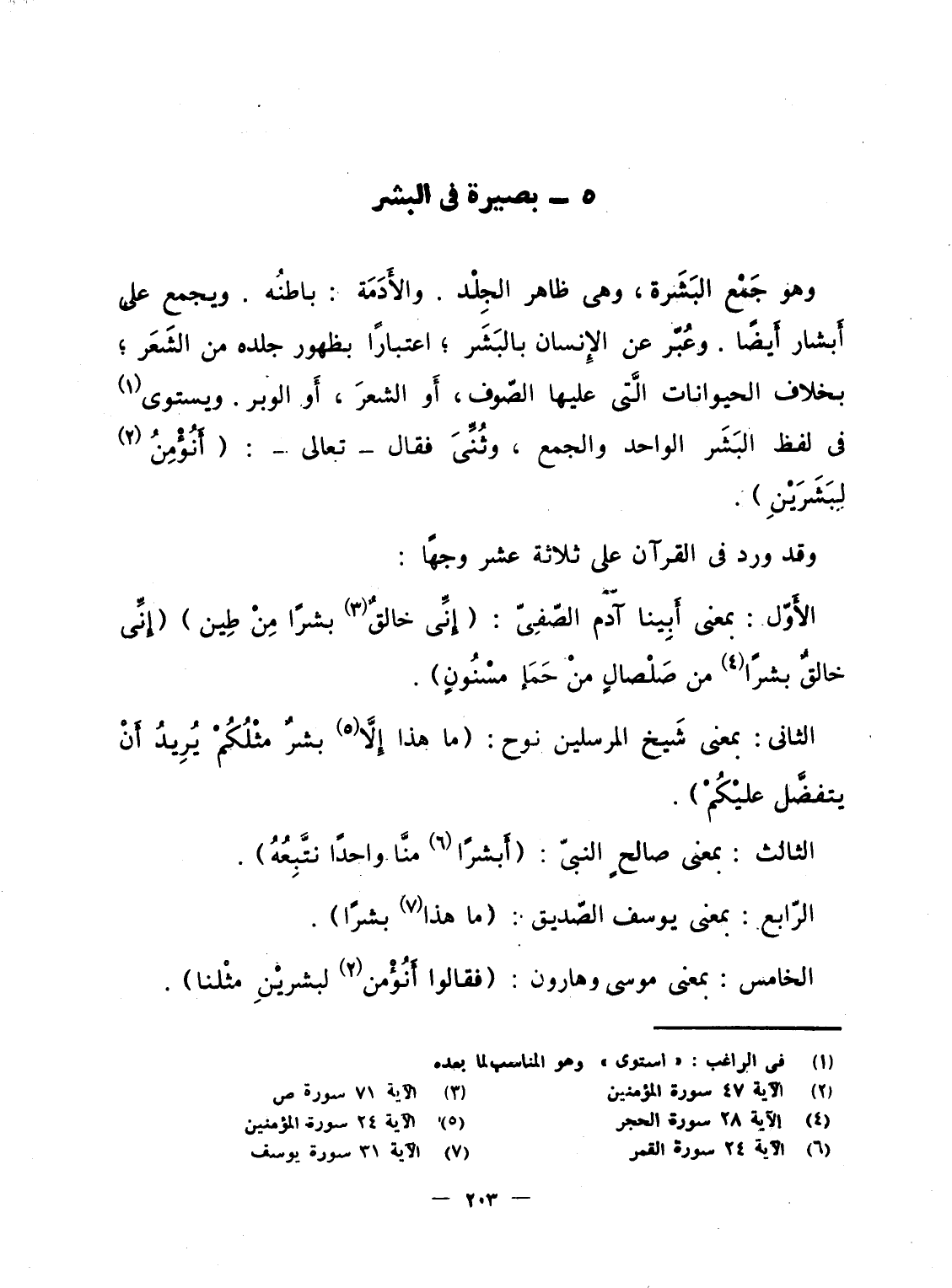 وهو جَمْع البَشَرة، وهى ظاهر الجِلْد. والأَدَمَة: باطنُه. ويجمع على أَبشار أَيضاً. وعُبّر عن الإِنسان بالبَشَر؛ اعتباراً بظهور جلده من الشَعَر؛ بخلاف الحيوانات الَّتى عليها الصّوف، أَو الشعرَ، أَو الوبر. ويستوى فى لفظ البَشَر الواحد والجمع، وثُنِّىَ فقال - تعالى -: {أَنُؤْمِنُ لِبَشَرَيْنِ} .