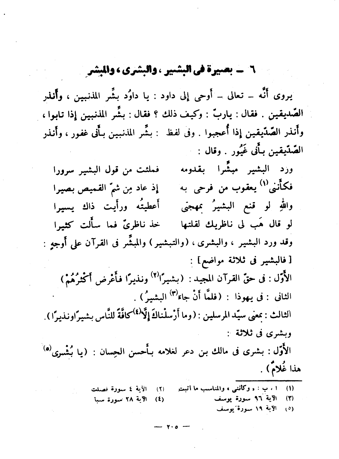 وقد ورد بالبشير، والبشرى، (والتبشير) والمبشِّر فى القرآن على أَوجهٍ: [فالبشير فى ثلاثة مواضع] .
