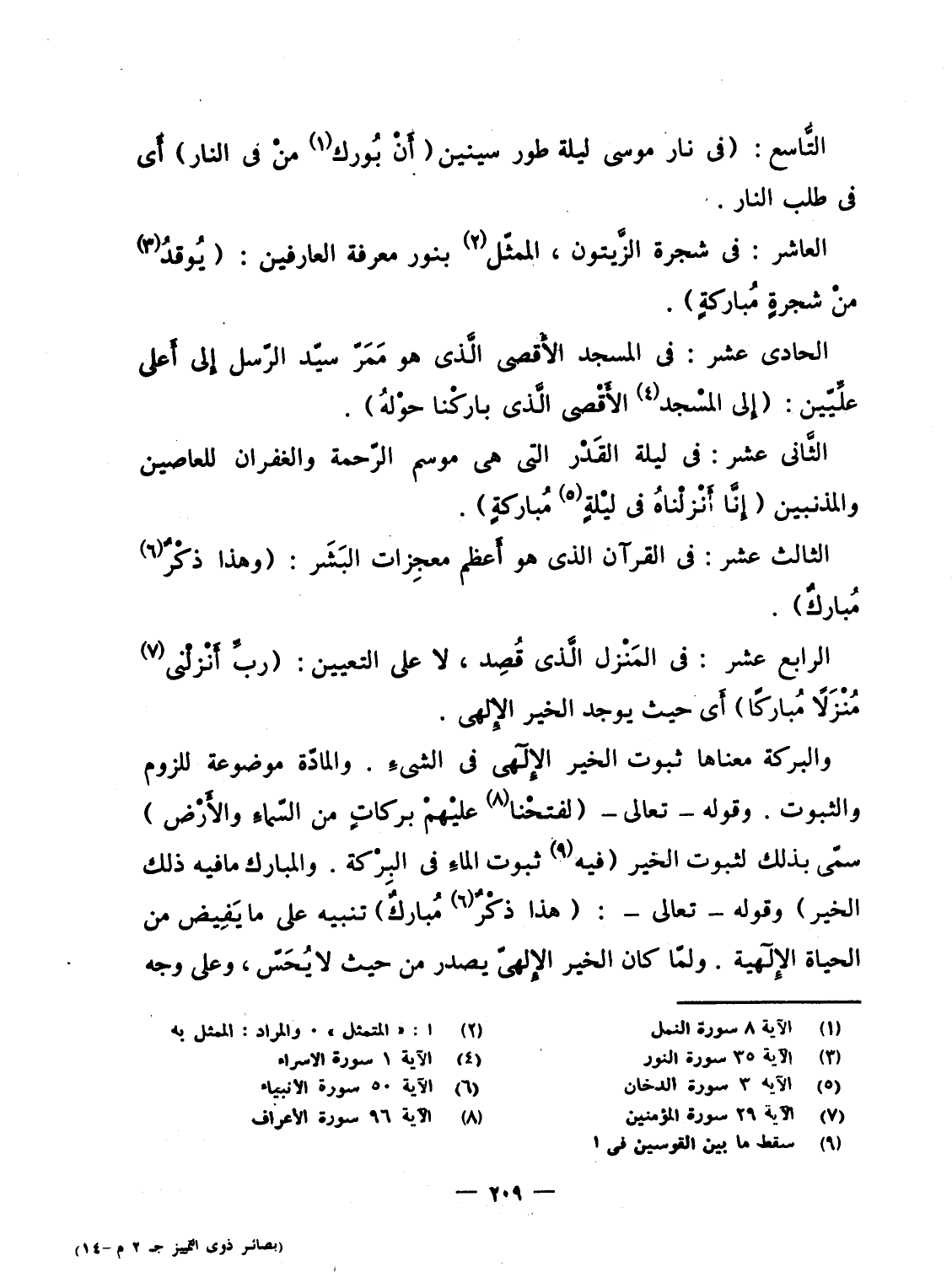 التَّاسع: (فى نار موسى ليلة طور سينين {أَن بُورِكَ مَن فِي النار} أَى فى طلب النار) .