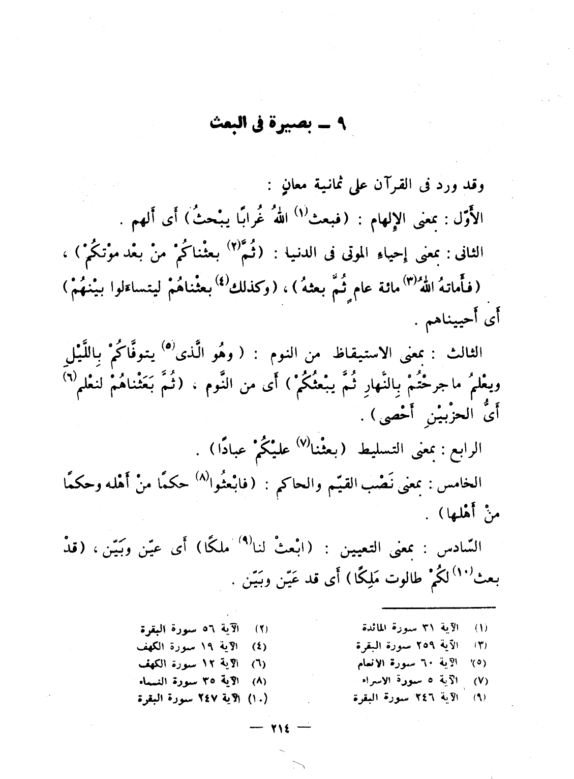 الثانى: بمعنى إِحياءِ الموتى فى الدنيا: {ثُمَّ بَعَثْنَاكُم مِّن بَعْدِ مَوْتِكُمْ} ، {فَأَمَاتَهُ الله مِئَةَ عَامٍ ثُمَّ بَعَثَهُ} ، {وكذلك بَعَثْنَاهُمْ لِيَتَسَآءَلُوا بَيْنَهُمْ} أَى أَحييناهم.