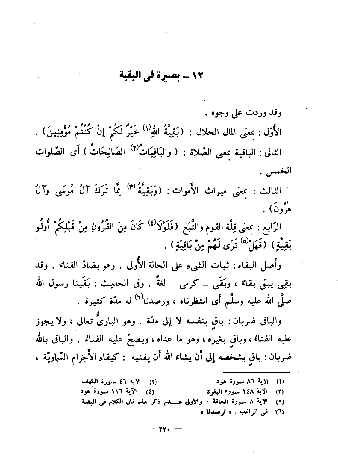 الرّابع: بمعنى قِلَّة القوم والتَّبَع {فَلَوْلاَ كَانَ مِنَ القرون مِن قَبْلِكُمْ أُوْلُواْ بَقِيَّةٍ} {فَهَلْ ترى لَهُم مِّن بَاقِيَةٍ} .