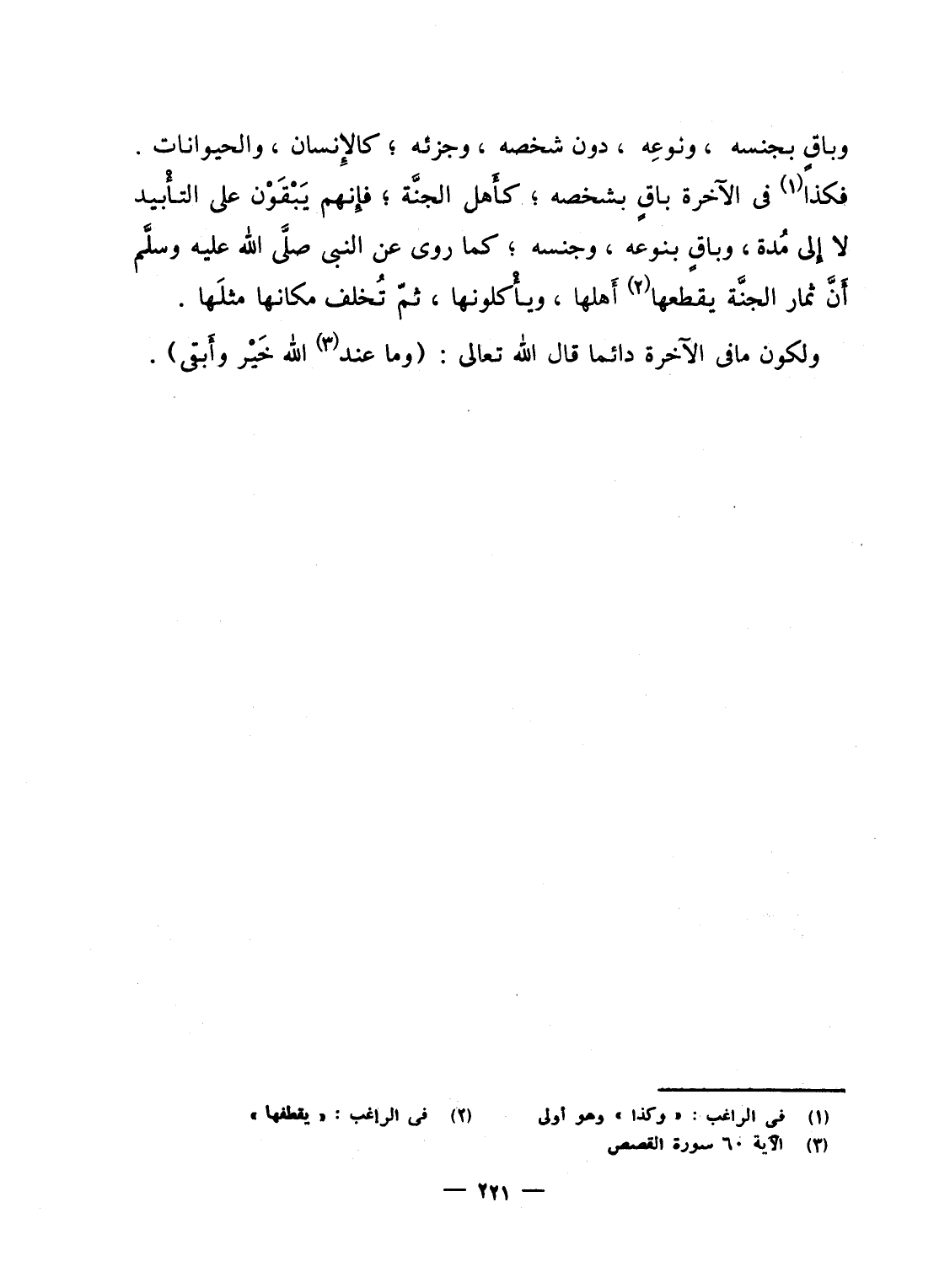 وباقٍ بجنسه، ونوعِه، دون شخصه، وجزئه، كالإِنسان، والحيوانات. فكذا فى الآخرة باقٍ بشخصه؛ كأَهل الجنَّة؛ فإِنهم يَبْقَوْن على التأْبيد لا إِلى مُدة، وباقٍ بنوعه، وجنسه؛ كما روى عن النبى صلَّى الله عليه وسلَّم أَنَّ ثمار الجنَّة يقطعها أَهلها، ويأْكلونها، ثمّ تُخلف مكانها مثلَها.