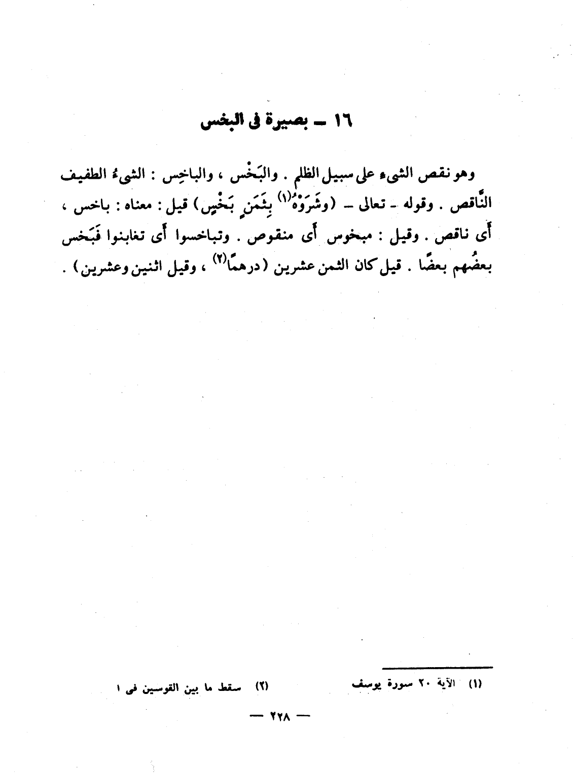 وهو نقص الشئِ على سبيل الظلم. والبَخْس، والباخِس: الشئُ الطفيف النَّاقص. وقوله - تعالى - {وَشَرَوْهُ بِثَمَنٍ بَخْسٍ} قيل: معناه: باخس، أى ناقص. وقيل: مبخوس أَى منقوص. وتباخسوا أَى تغابنوا فَبَخس بعضُهم بعضاً. قيل كان الثمن عشرين (درهماً، وقيل اثنين وعشرين) .