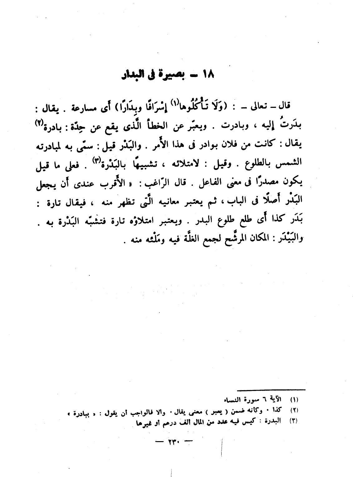 قال - تعالى -: {وَلاَ تَأْكُلُوهَآ إِسْرَافاً وَبِدَاراً} أَى مسارعة. يقال: بدَرتُ إِليه، وبادرت. ويعبّر عن الخطأ الَّذى يقع عن حِدّة: بادرة يقال: كانت من فلان بوادر فى هذا الأَمر. والبَدْر قيل: سمّى به لمبادرته الشمس بالطلوع. وقيل: لامتلائه، تشبيهاً بالبَدْرة. فعلى ما قيل يكون مصدراً فى معنى الفاعل. قال الرّاغب: "الأَقرب عندى أَن يجعل البَدْر أَصلاً فى الباب، ثم يعتبر معانيه الَّتى تظهر منه، فيقال تارة: بَدَر كذا أَى طلع طلوع البدر. ويعتبر امتلاؤه تارة فتشبّه البَدْرة به. والبَيْدَر: المكان المرشَّح لجمع الغلَّة فيه ومَلْئه منه.