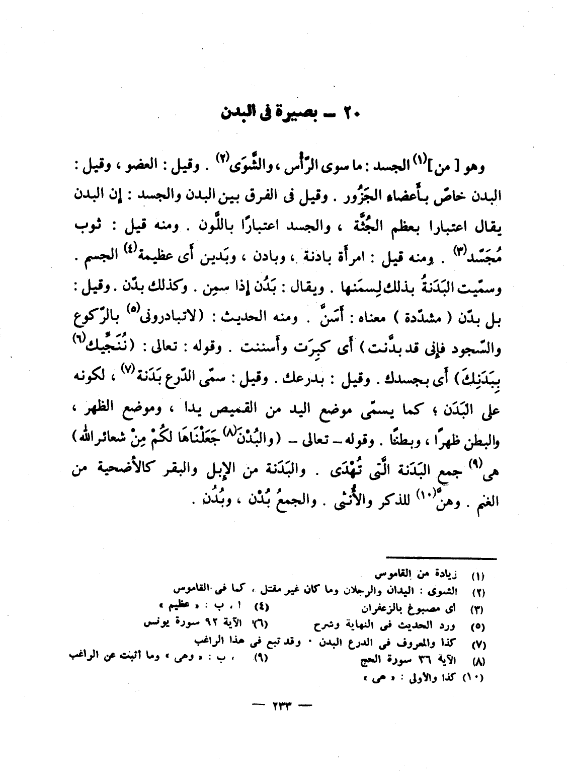 وهو [من] الجسد: ما سوى الرّأَس، والشَّوَى. وقيل: العضو، وقيل: البدن خاصّ بأَعضاءِ الجَزُور. وقيل فى الفرق بين البدن والجسد: إِن البدن يقال اعتبارا بعظم الجُنَّة، والجسد اعتباراً باللَّون. ومنه قيل: ثوب مُجَسّد. ومنه قيل: امرأَة بادنة، وبادن، وبَدين أَى عظيمة الجسم. وسمّيت البَدَنةُ بذلك لِسمَنها. ويقال: بَدُن إِذا سمِن. وكذلك بدّن. وقيل: بل بدّن (مشدّدة) معناه: أَسَنَّ. ومنه الحديث: "لا تبادرونى بالرّكوع والسّجود فإِنى قد بدَّنت" أَى كبِرَت وأَسننت. وقوله: تعالى: {نُنَجِّيكَ بِبَدَنِكَ} أَى بجسدك. وقيل: بدرعك. وقيل: سمّى الدّرع بَدَنة، لكونه على البَدَن؛ كما يسمّى موضع اليد من القميص يدا، وموضع الظهر، والبطن ظهراً، وبطناً. وقوله - تعالى - {والبدن جَعَلْنَاهَا لَكُمْ مِّن شَعَائِرِ الله} هى جمع البَدَنة الَّتى تُهْدَى. والبَدَنة من الإِبل والبقر كالأضحية من الغنم. وهنَّ للذكر والأُنثى. والجمعُ بُدْن، وبُدُن.