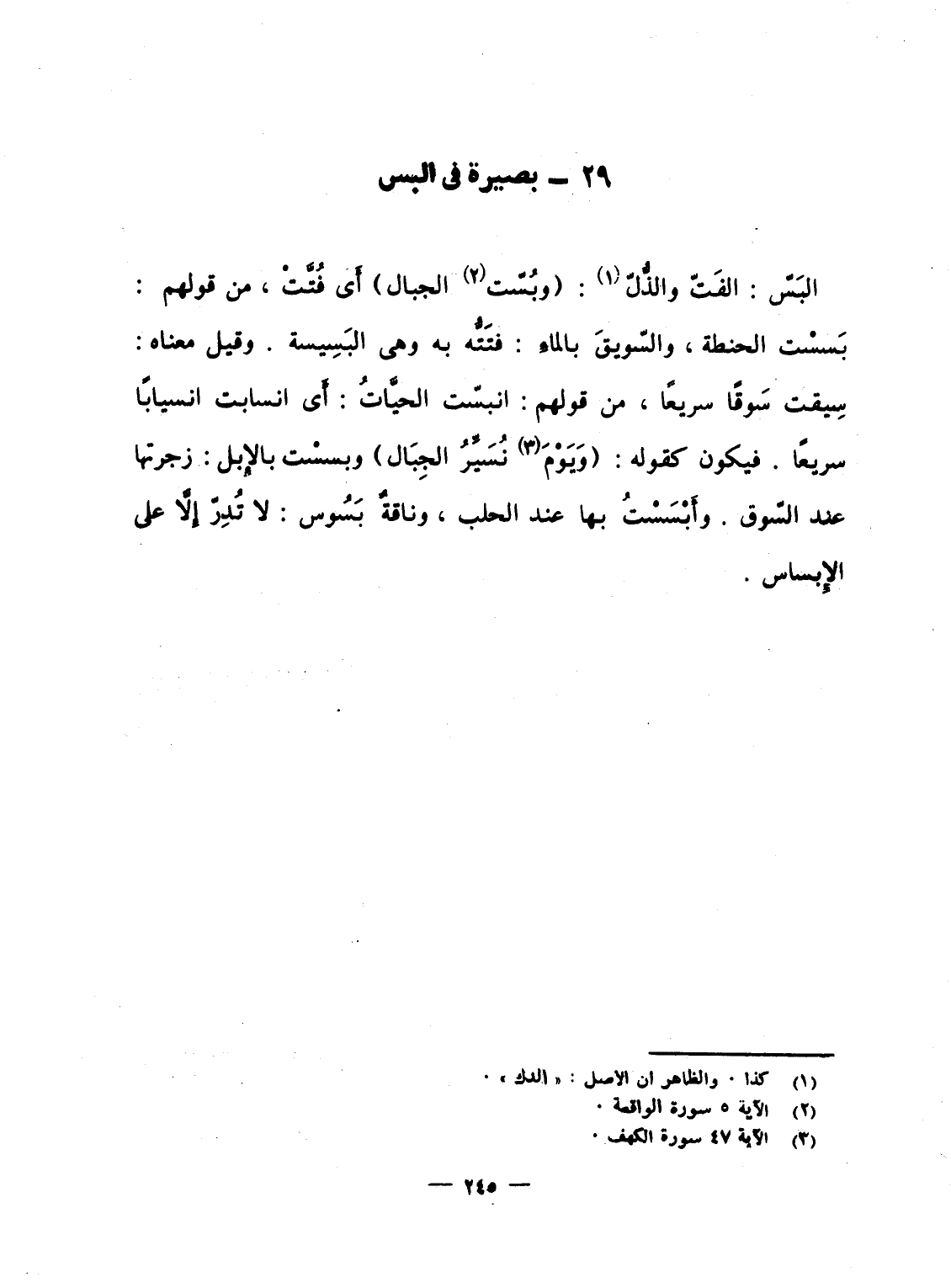 البَسّ: الفَتّ والذُّلّ: {وَبُسَّتِ الجبال} أَى فُتَّتْ، من قولهم: بَسسْت الحنطة، والسّويقَ بالماءِ: فتَتُّه به وهى البَسِيسة. وقيل معناه: سِيقت سَوقاً سريعاً، من قولهم: انبسّت الحيَّاتُ: أَى انسابت انسياباً سريعاً. فيكون كقوله: {وَيَوْمَ نُسَيِّرُ الجبال} وبسسْت بالإِبل: زجرتها عند السّوق. وأَبْسَسْتُ بها عند الحلب، وناقةٌ بَسُوس: لا تُدِرّ إِلاَّ على الإِبساس.