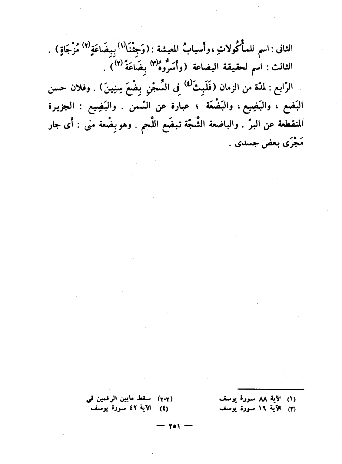 الرّابع: لمدّة من الزمان {فَلَبِثَ فِي السجن بِضْعَ سِنِينَ} . وفلان حسن البَضع، والبَضِيع، والبَضْعَة؛ عبارة عن السّمن. والبَضِيع: الجزيرة المنقطعة عن البرّ. والباضعة الشَّجّة تبضَع اللَّحم. وهو بِضْعة منى: أَى جار مَجْرَى بعض جسدى.
