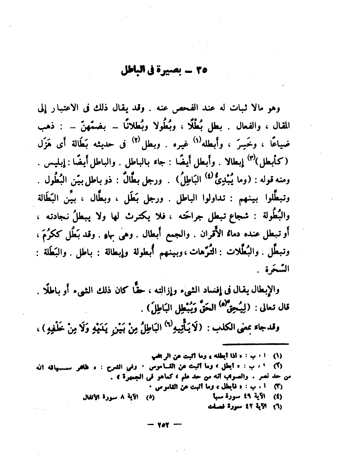 وهو مالا ثبات له عند الفحص عنه. وقد يقال ذلك فى الاعتبار إِلى المقال. والفعال، بطل بُطْلاً، وبُطُولا وبُطلاناً - بضمّهنّ -: ذهب ضياعاً، وخَسِرَ، وأَبطله غيره. وبطل فى حديثه بَطَالة أَى هَزَل (كأَبطل) إِبطالا. وأَبطل أَيضاً: جاءَ بالباطل. والباطل أَيضاً: إِبليس. ومنه قوله: {وَمَا يُبْدِىءُ الباطل} . ورجل بطَّالٌ: ذو باطل بيّن البُطُول. وتبطَّلوا بينهم: تداولوا الباطل. ورجل بَطَل، وبطَّال، بيِّن البَطَالة والبُطُولة: شجاع تبطل جراحَته، فلا يكترث لها ولا يبطلُ نجادته، أَو تبطل عنده دماءُ الأَقران. والجمع أَبطال. وهى بهاءٍ. وقد بَطُل ككرُمَ، وتبطَّل. والبُطَّلات: التُرّهات، وبينهم أُبطولة وإِبطالة: باطل. والبَطَلة: السّحَرة.
