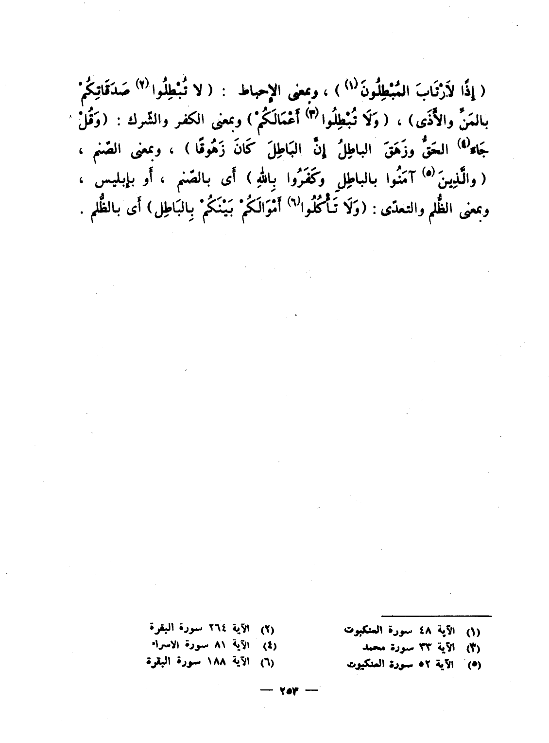 ، {إِذاً لاَّرْتَابَ المبطلون} ، وبمعنى الإِحباط: {لاَ تُبْطِلُواْ صَدَقَاتِكُم بالمن والأذى} ، {وَلاَ تبطلوا أَعْمَالَكُمْ} وبمعنى الكفر والشّرك: {وَقُلْ جَآءَ الحق وَزَهَقَ الباطل إِنَّ الباطل كَانَ زَهُوقاً} ، وبمعنى الصّنم، {والذين آمَنُواْ بالباطل وَكَفَرُواْ بالله} أَى بالصّنم، أَو بإِبليس، وبمعنى الظُّلم والتعدّى: {وَلاَ تأكلوا أَمْوَالَكُمْ بَيْنَكُمْ بالباطل} أَى بالظُّلم.