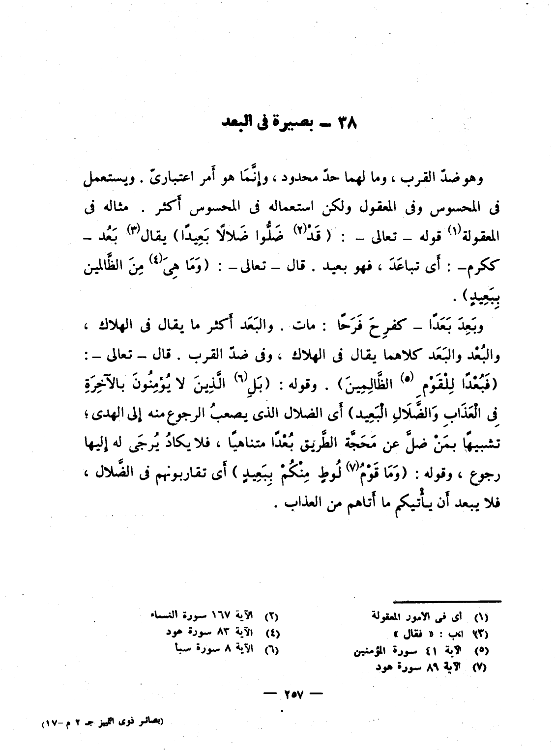 وبَعِدَ بَعَداً - كفرِحَ فَرَحاً: مات. والبَعَد أَكثر ما يقال فى الهلاك، والبُعْد والبَعَد كلاهما يقال فى الهلاك، وفى ضدّ القرب. قال - تعالى -: {فَبُعْداً لِّلْقَوْمِ الظالمين} . وقوله: {بَلِ الذين لاَ يُؤْمِنُونَ بالآخرة فِي العذاب والضلال البعيد} أَى الضلال الذى يصعبُ الرجوع منه إِلى الهدى؛ تشبيهاً بمَنْ ضلَّ عن مَحَجَّة الطَّريق بُعْداً متناهياً، فلا يكادُ يُرجَى له إِليها رجوع، وقوله: {وَمَا قَوْمُ لُوطٍ مِّنكُم بِبَعِيدٍ} أَى تقاربونهم فى الضَّلال، فلا يبعد أَن يأْتيكم ما أَتاهم من العذاب.