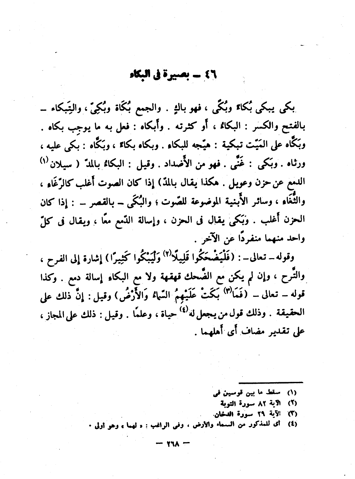 وقوله - تعالى -: {فَلْيَضْحَكُواْ قَلِيلاً وَلْيَبْكُواْ كَثِيراً} إِشارة إِلى الفرح، والتَّرح، وإِن لم يكن مع الضَّحك قهقهة ولا مع البكاءِ إِسالة دمع. وكذا قوله - تعالى - {فَمَا بَكَتْ عَلَيْهِمُ السمآء والأرض} وقيل: إِنَّ ذلك على الحقيقة. وذلك قول من يجعل له حياة، وعلماً. وقيل: ذلك على المجاز، على تقدير مضاف أَى أَهلهما.