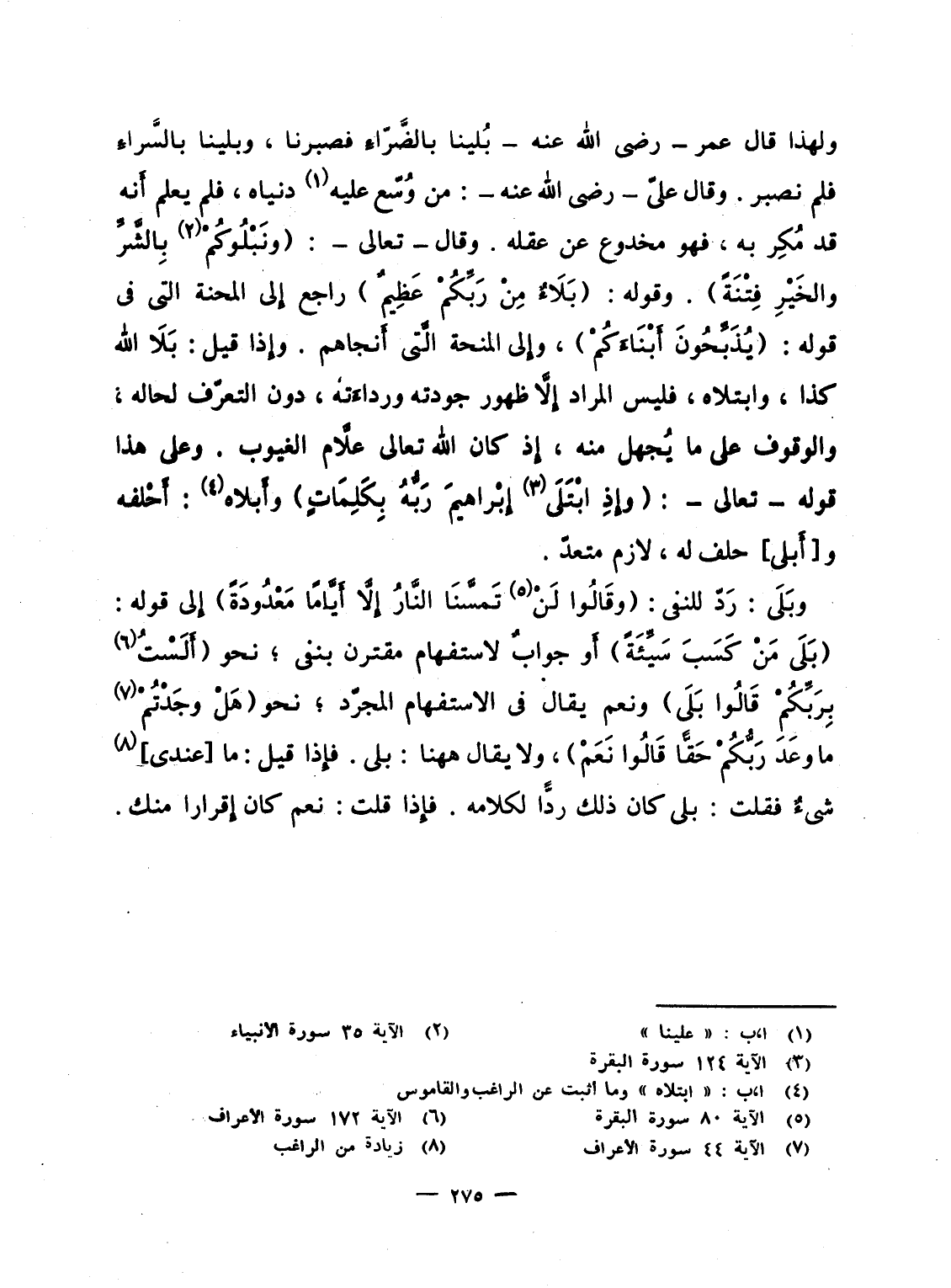 لهذا قال عمر - رضى الله عنه - بُلينا بالضَّرّاءِ فصبرنا، وبلينا بالسَّراءِ فلم نصبر. وقال علىّ - رضى الله عنه -: من وُسّع عليه دنياه، فلم يعلم أَنه قد مُكِر به، فهو مخدوع عن عقله. وقال - تعالى -: {وَنَبْلُوكُم بالشر والخير فِتْنَةً} . وقوله: {بَلاَءٌ مِنْ رَبِّكُمْ عَظِيمٌ} راجع إِلى المحنة التى فى قوله: {يُذَبِّحُونَ أَبْنَاءَكُمْ} ، وإِلى المنحة الَّتى أَنجاهم. وإِذا قيل: بَلاَ الله كذا، وابتلاه، فليس المراد إِلاَّ ظهور جودته ورداءَته، دون التعرّف لحاله، والوقوف على ما يُجهل منه، إِذ كان الله تعالى علاَّم الغيوب، وعلى هذا قوله - تعالى -: {وَإِذِ ابتلى إِبْرَاهِيمَ رَبُّهُ بِكَلِمَاتٍ} وأَبلاه: أَحْلفه و [أَبلى] حلف له، لازم متعدّ.