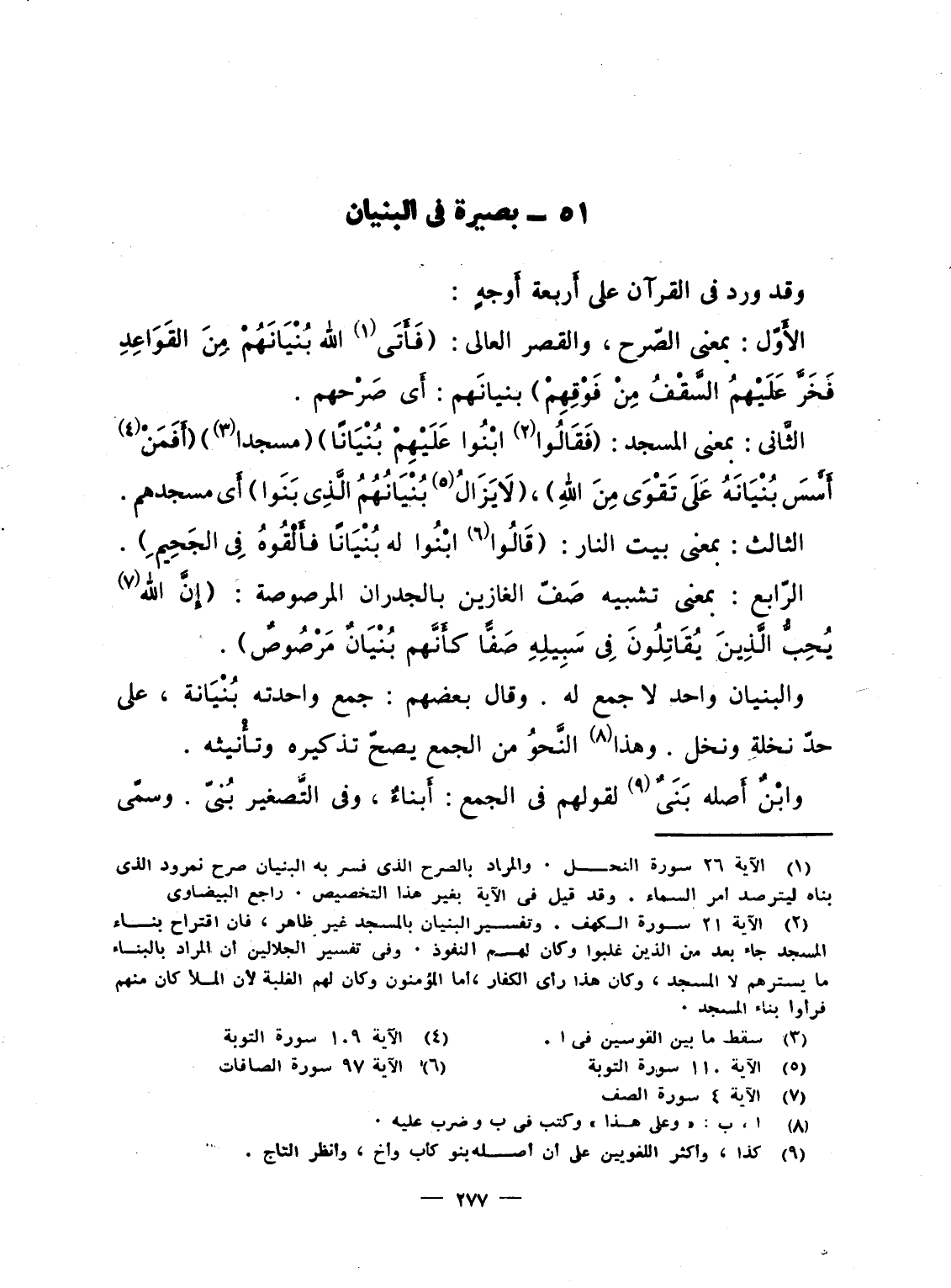 الثَّانى: بمعنى المسجد: {فَقَالُواْ ابنوا عَلَيْهِمْ بُنْيَاناً} (مسجدا) {أَفَمَنْ أَسَّسَ بُنْيَانَهُ على تقوى مِنَ اللَّهِ} ، {لاَ يَزَالُ بُنْيَانُهُمُ الذي بَنَوْاْ} أَى مسجدهم.