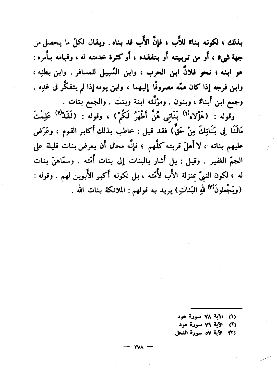 وقوله: {هاؤلاء بَنَاتِي هُنَّ أَطْهَرُ لَكُمْ} ، وقوله: {لَقَدْ عَلِمْتَ مَا لَنَا فِي بَنَاتِكَ مِنْ حَقٍّ} فقد قيل: خاطب بذلك أَكابر القوم، وعَرَض عليهم بناته، لا أَهلَ قريته كلَّهم؛ فإِنَّه محال أَن يعرض بنات قليلة على الجمّ الغفير. وقيل: بل أَشار بالبنات إِلى بنات أُمّته. سمّاهنّ بنات له؛ لكون النبىّ بمنزلة الأَب لأُمّته، بل لكونه أَكبر الأَبوين لهم. وقوله: {وَيَجْعَلُونَ لِلَّهِ البنات} يريد به قولهم: الملائكة بنات الله.