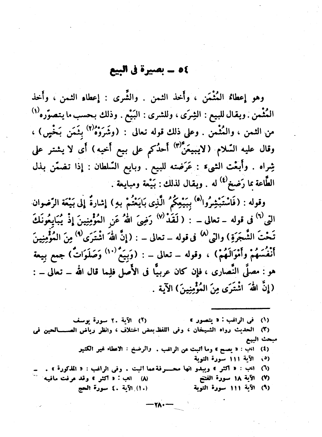 وقوله: {فاستبشروا بِبَيْعِكُمُ الذي بَايَعْتُمْ بِهِ} إِشارةٌ إِلى بَيْعَة الرّضوان التى فى قوله - تعالى -: {لَّقَدْ رَضِيَ الله عَنِ المؤمنين إِذْ يُبَايِعُونَكَ تَحْتَ الشجرة} والتى فى قوله - تعالى -: {إِنَّ الله اشترى مِنَ المؤمنين أَنفُسَهُمْ وَأَمْوَالَهُمْ} ، وقوله - تعالى -: {وَبِيَعٌ وَصَلَوَاتٌ} جمع بِيعة هو: مصلَّى النَّصارى، فإِن كان عربيّاً فى الأَصل فلِما قال الله - تعالى -: {إِنَّ اللهَ اشْتَرَى مِنَ المُؤْمِنِينَ} الآية.