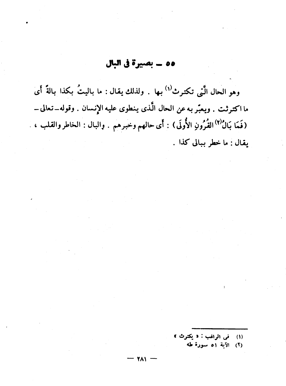 وهو الحال الَّتى تكثرت بها. ولذلك يقال: ما باليتُ بكذا بالةً أَى ما اكترثت. ويعبّر به عن الحال الَّذى ينطوى عليه الإِنسان، وقوله - تعالى - {فَمَا بَالُ القرون الأولى} : أَى حالهم وخبرهم. والبال: الخاطر والقلب، يقال: ما خطر ببالى كذا.